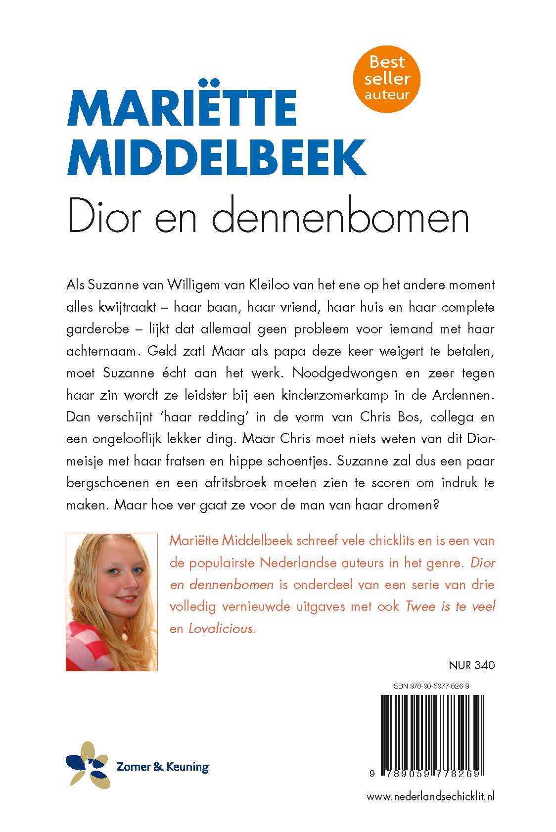 'Dior en dennenbomen' is een hilarische romcom van Mariëtte Middelbeek. Eerder verschenen van haar ook 'Lovalicious', 'Twee is teveel', 'Sterrenstatus', 'Revanche in New York' en 'Hex'.