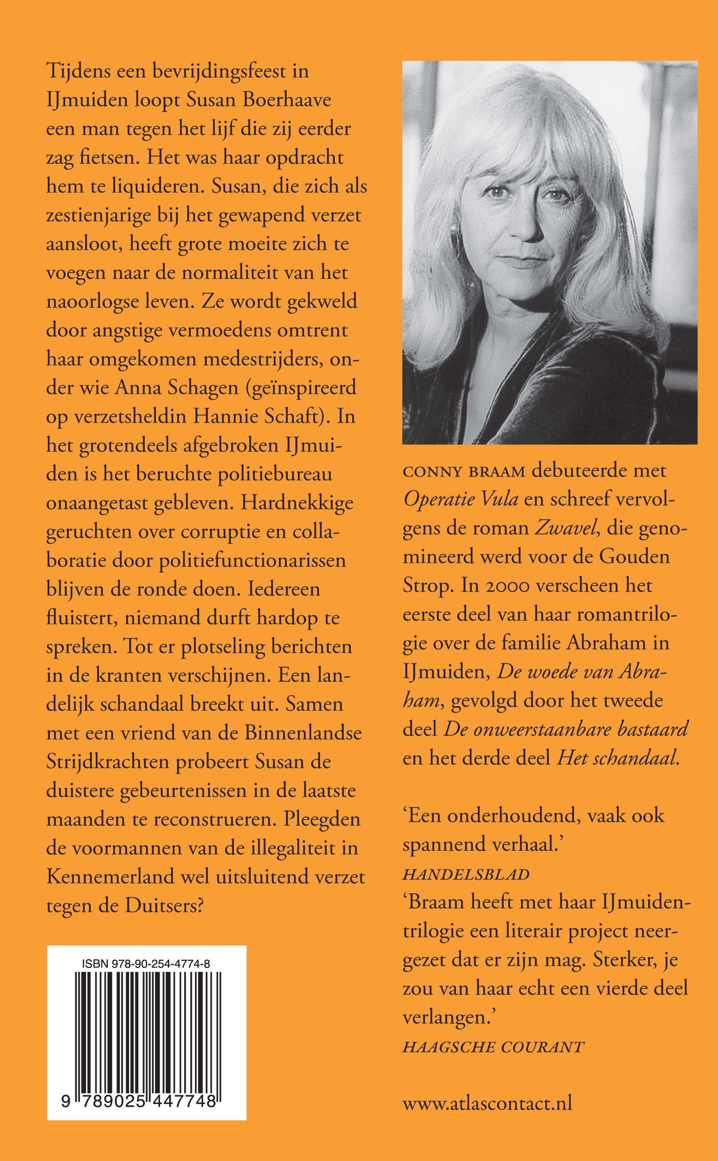 Tijdens een bevrijdingsfeest in IJmuiden loopt Susan Boerhaave een man tegen het lijf die zij eerder zag fietsen langs het kanaal. Het was haar opdracht hem te liquideren. Susan, die zich als zestienjarige bij het gewapend verzet aansloot, heeft grote moeite zich te voegen naar de normaliteit van het naoorlogse leven. Ze wordt gekweld door angstige vermoedens omtrent haar omgekomen medestrijders, onder wie Anna Schagen ( geïnspireerd op verzetsheldin Hannie Schaft). In het grotendeels afgebroken IJmuiden is het beruchte politiebureau onaangetast gebleven. Hardnekkige geruchten over corruptie en collaboratie door politiefunctionarissen blijven de ronde doen. Iedereen fluistert, niemand durft hardop te spreken. Tot er plotseling berichten in de kranten verschijnen. Een landelijk schandaal breekt uit. Samen met een vriend van de Binnenlandse Strijdkrachten probeert Susan de duistere gebeurtenissen in de laatste maanden te reconstrueren. Pleegden de voormannen van de illegaliteit in Kennemerland wel uitsluitend verzet tegen de Duitsers?