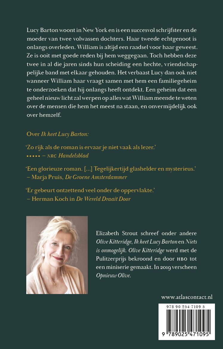 ‘Het verhaal van William’ van Elizabeth Strout gaat over Lucy Barton: wonend in New York, succesvol schrijfster en de moeder van twee volwassen dochters. Haar tweede echtgenoot is onlangs overleden. William is altijd een raadsel voor haar geweest. Ze is ooit met goede reden bij hem weggegaan. Toch hebben deze twee in al die jaren sinds hun scheiding een hechte, vriendschappelijke band met elkaar gehouden. Het verbaast Lucy dan ook niet wanneer William haar vraagt samen met hem een familiegeheim te onderzoeken dat hij onlangs heeft ontdekt. Een geheim dat een geheel nieuw licht zal werpen op alles wat William meende te weten over de mensen die hem het meest na staan, en onvermijdelijk ook over hemzelf.