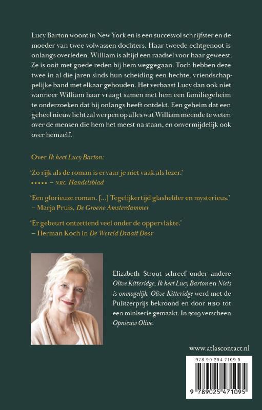 ‘Het verhaal van William’ van Elizabeth Strout gaat over Lucy Barton: wonend in New York, succesvol schrijfster en de moeder van twee volwassen dochters. Haar tweede echtgenoot is onlangs overleden. William is altijd een raadsel voor haar geweest. Ze is ooit met goede reden bij hem weggegaan. Toch hebben deze twee in al die jaren sinds hun scheiding een hechte, vriendschappelijke band met elkaar gehouden. Het verbaast Lucy dan ook niet wanneer William haar vraagt samen met hem een familiegeheim te onderzoeken dat hij onlangs heeft ontdekt. Een geheim dat een geheel nieuw licht zal werpen op alles wat William meende te weten over de mensen die hem het meest na staan, en onvermijdelijk ook over hemzelf.