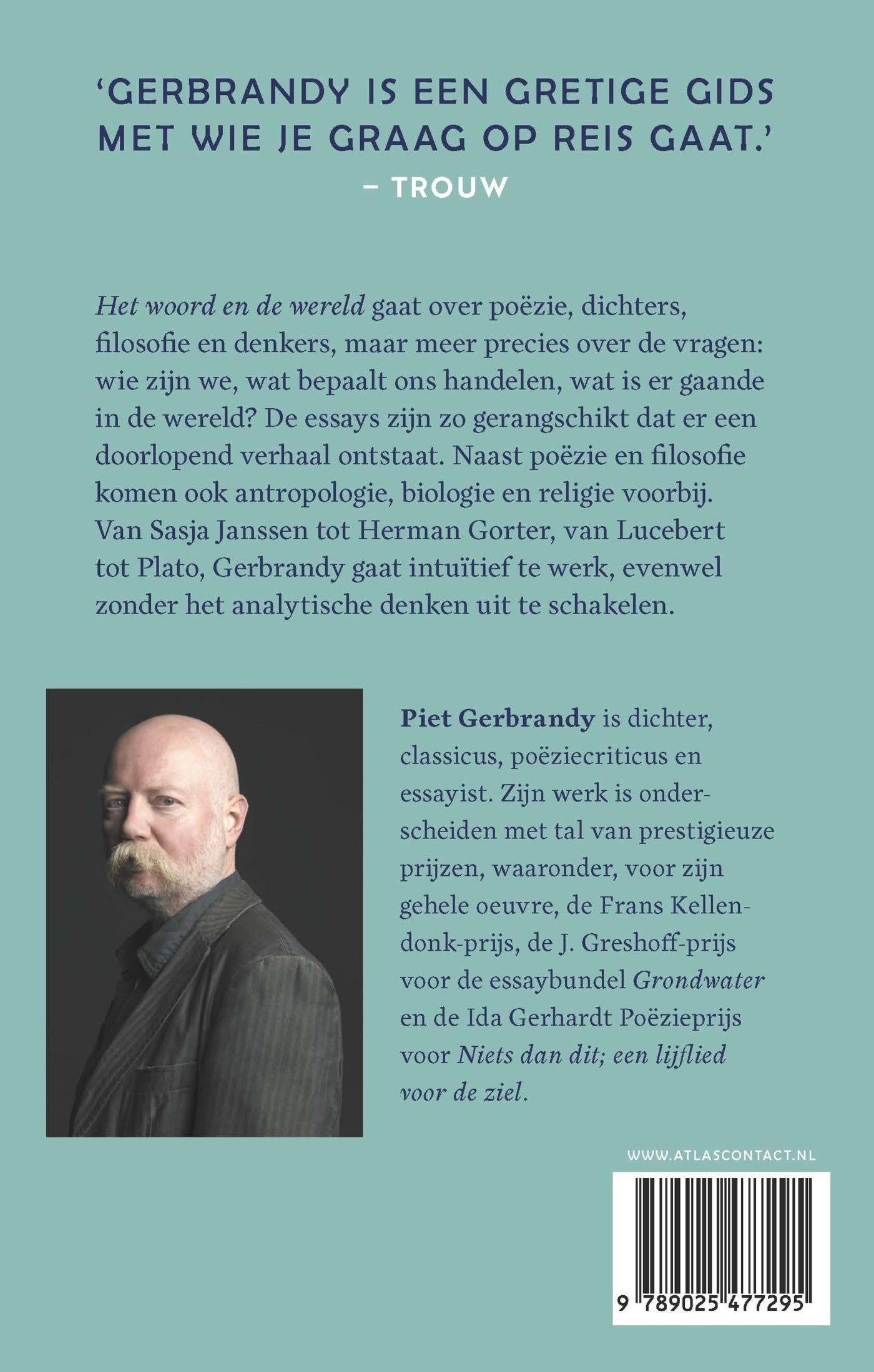 Het woord en de wereld gaat over poëzie, dichters, filosofie en denkers, maar meer precies over de vragen: wie zijn we, wat bepaalt ons handelen, wat is er gaande in de wereld? De essays zijn zo gerangschikt dat er een doorlopend verhaal ontstaat. Naast poëzie en filosofie komen ook voorbij: antropologie, biologie en religie. Van Sasja Janssen tot Herman Gorter, van Lucebert tot Plato, Gerbrandy gaat intuïtief te werk, evenwel zonder het analytische denken uit te schakelen.