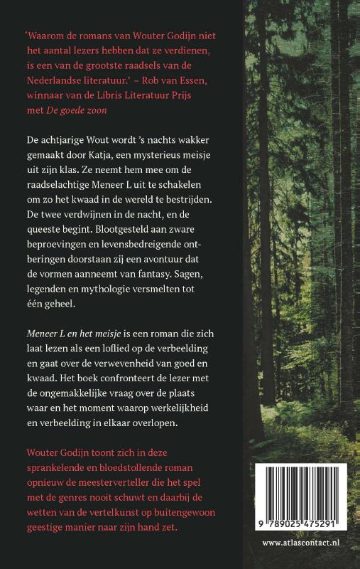 De achtjarige Wout wordt s nachts wakker gemaakt door Katja, een mysterieus meisje uit zijn klas. Ze neemt hem mee om de raadselachtige Meneer L. uit te schakelen om zo het kwaad in de wereld te bestrijden. De twee verdwijnen in de nacht, en de queeste begint. Blootgesteld aan zware beproevingen en levensbedreigende ontberingen doorstaan zij een avontuur dat de vorm aanneemt van fantasy. Sagen, legenden en mythologie versmelten tot één geheel.