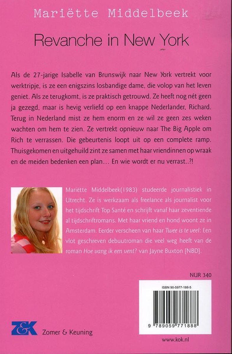 Mariëtte Middelbeek neemt je in 'Revanche in New York' met Isabelle mee naar the Big Apple. Eerder verschenen van haar ook 'Dior en dennenbomen', 'Twee is teveel', 'Sterrenstatus', 'Lovalicious' en 'Hex'.