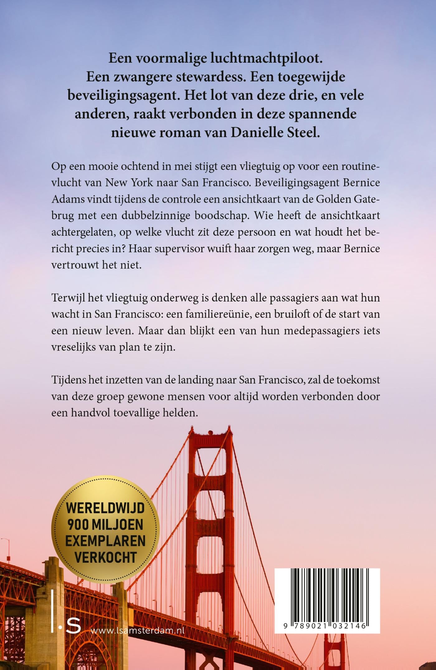 In Toevallige helden van Danielle Steel vindt beveiligingsagente Bernice Adams in het vliegtuig, op een routinevlucht van New York naar San Francisco, een ansichtkaart van de Golden Gate Bridge met een verontrustende boodschap. Wie heeft de ansichtkaart achtergelaten, waar is die persoon nu, en wat betekent de boodschap precies? Wanhopig probeert ze aandacht te vragen, want ze weet dat er levens op het spel kunnen staan.