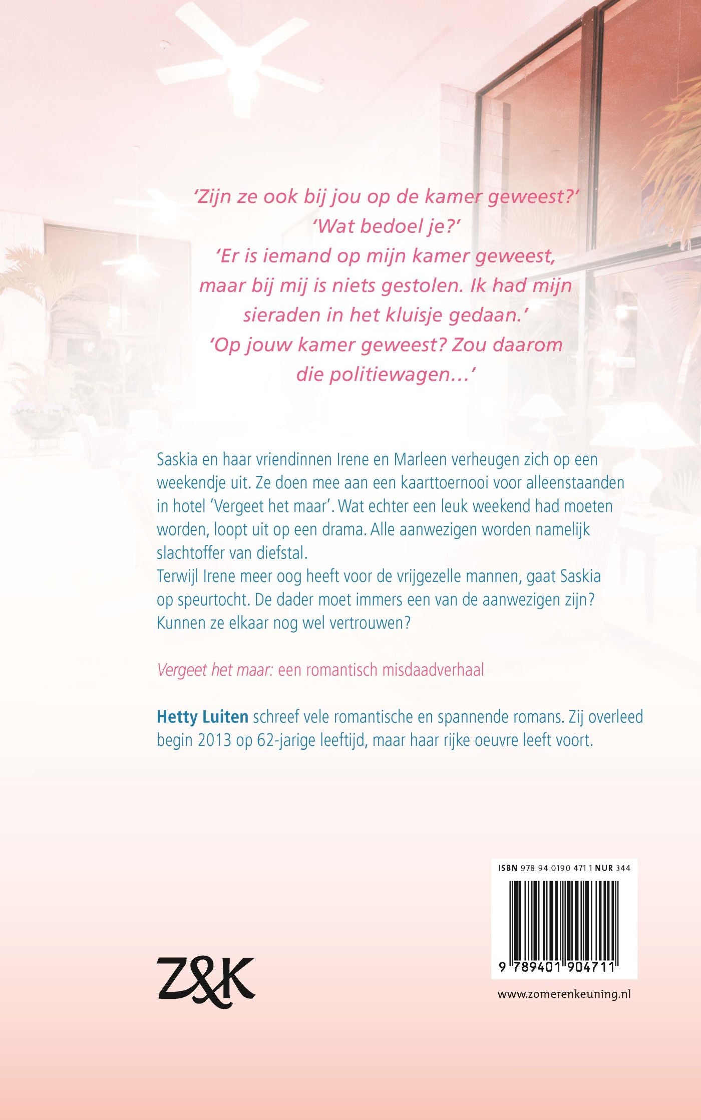 Vergeet het maar is een van de vele romantische en spannende romans van Hetty Luiten. De auteur overleed begin 2013 geheel onverwachts op 62-jarige leeftijd, maar haar rijke oeuvre leeft voort.