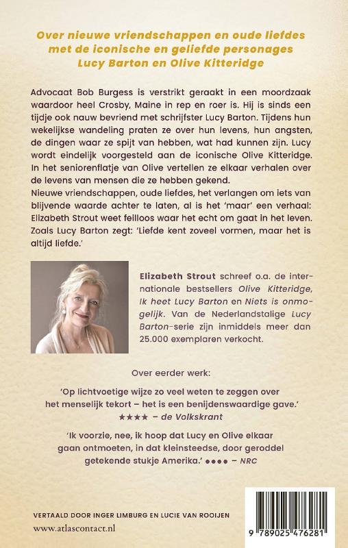 Nieuwe vriendschappen, oude liefdes, het verlangen om iets van blijvende waarde achter te laten, al is het maar een verhaal: Elizabeth Strout weet feilloos waar het echt om gaat in het leven. Zoals Lucy Barton zegt: Liefde kent zoveel vormen, maar het is altijd liefde.