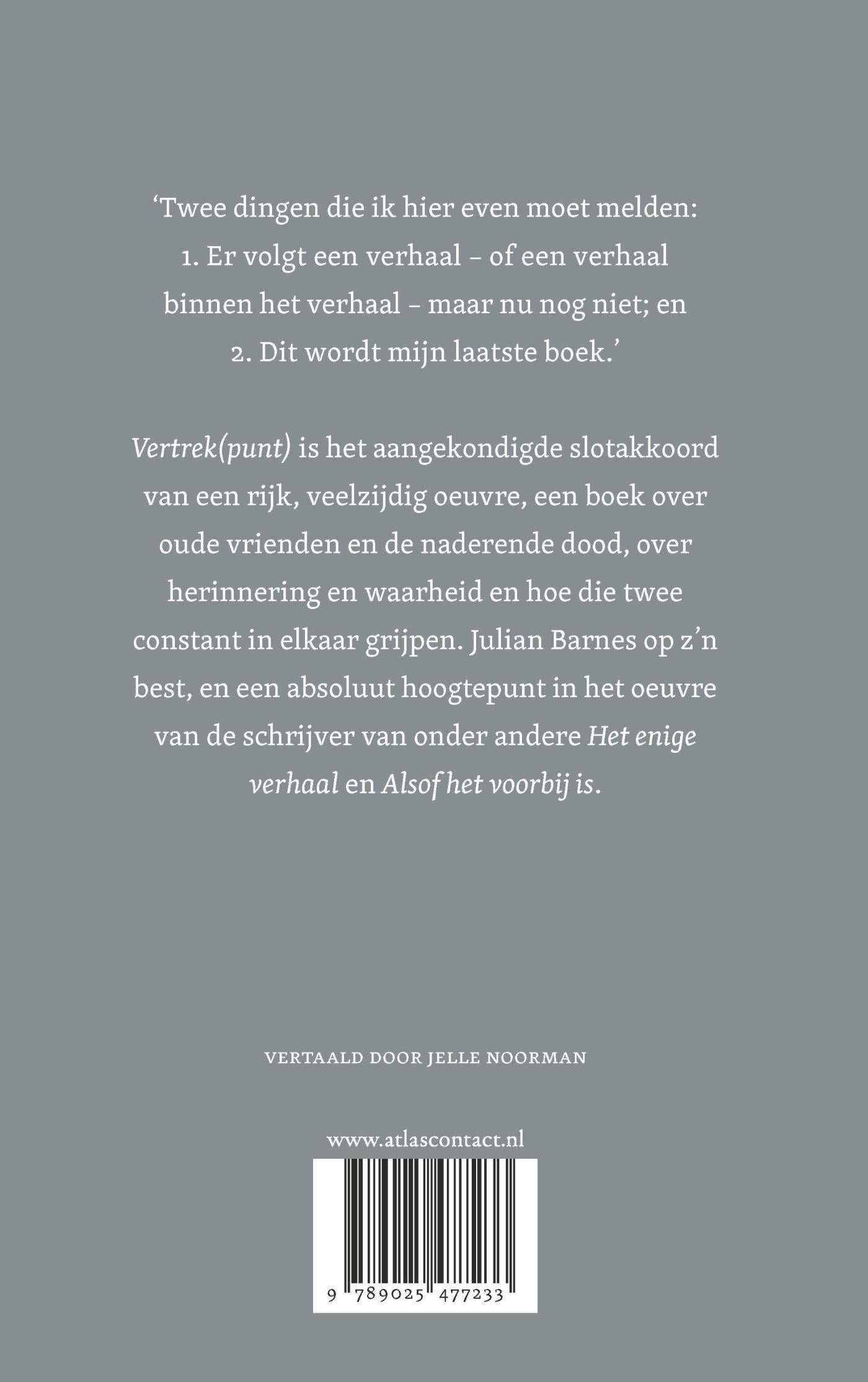 Vertrek(punt) is het aangekondigde slotakkoord van een rijk, veelzijdig oeuvre, een boek over oude vrienden en de naderende dood, over herinnering en waarheid en hoe die twee constant in elkaar grijpen. Julian Barnes op z’n best, en een absoluut hoogtepunt in het oeuvre van de schrijver van onder andere ‘Het enige verhaal’ en ‘Alsof het voorbij is’.