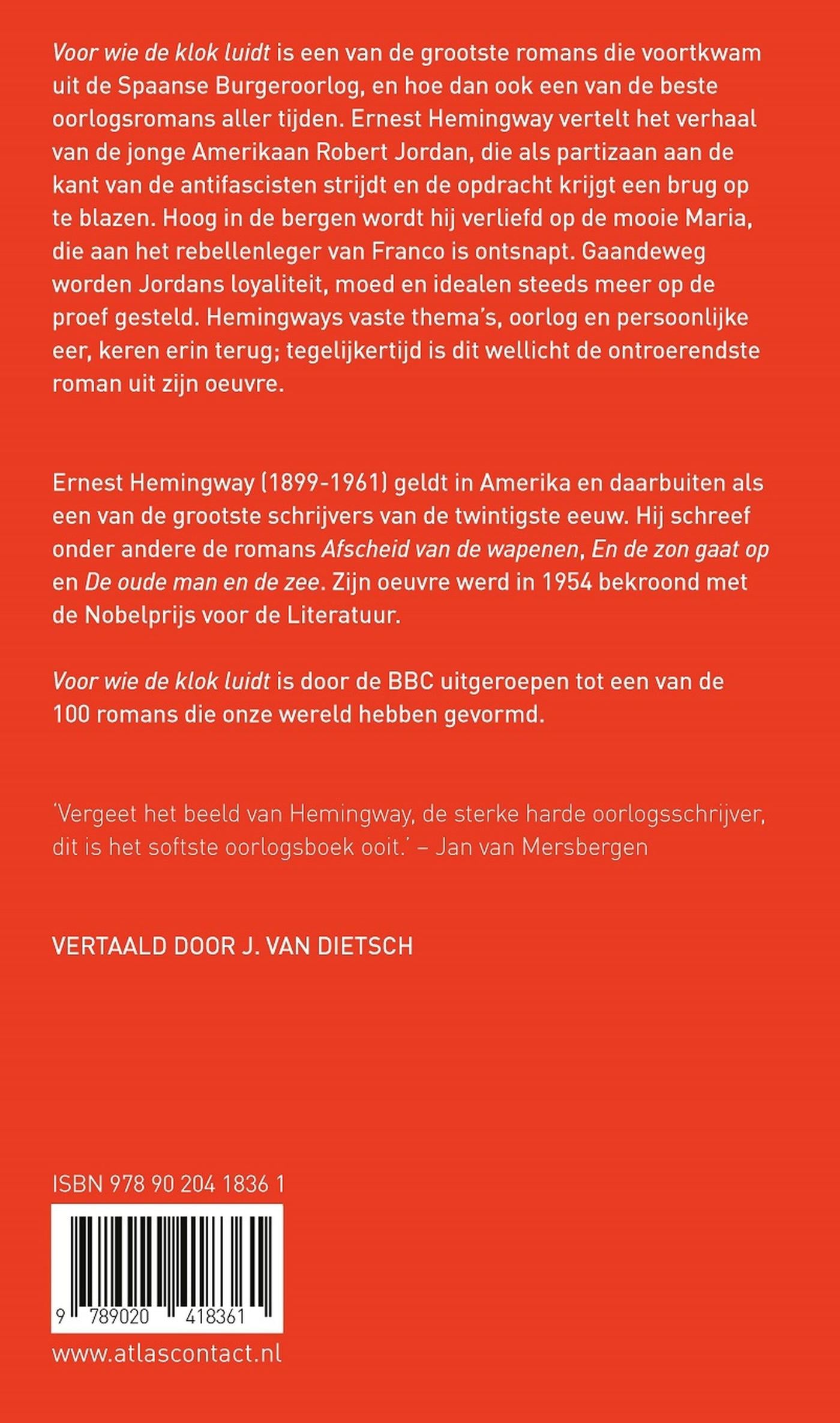 Voor wie de klok luidt is een van de grootste romans die voortkwam uit de Spaanse Burgeroorlog, en hoe dan ook een van de beste oorlogsromans aller tijden. Ernest Hemingway vertelt het verhaal van de jonge Amerikaan Robert Jordan, die als partizaan aan de kant van de antifascisten strijdt en de opdracht krijgt een brug op te blazen. Hoog in de bergen wordt hij verliefd op de mooie Maria, die aan het rebellenleger van Franco is ontsnapt. Gaandeweg worden Jordans loyaliteit, moed en idealen steeds meer op de proef gesteld. Hemingways vaste thema’s, oorlog en persoonlijke eer, keren erin terug; tegelijkertijd is dit wellicht de ontroerendste roman uit zijn oeuvre.