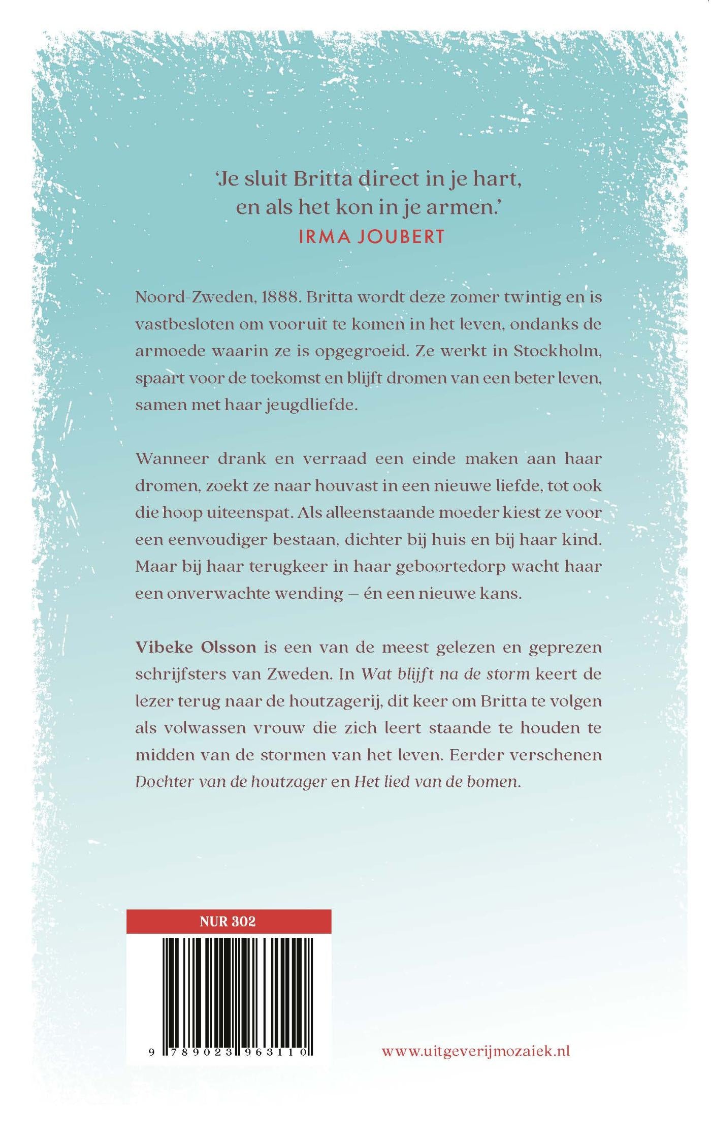'Wat blijft na de storm' van Vibeke Olsson is het derde deel in de historische romanserie over Britta. Ze is opgegroeid tot een jonge vrouw en vastbesloten om vooruit te komen in het leven, ondanks de armoede waarin ze leeft.