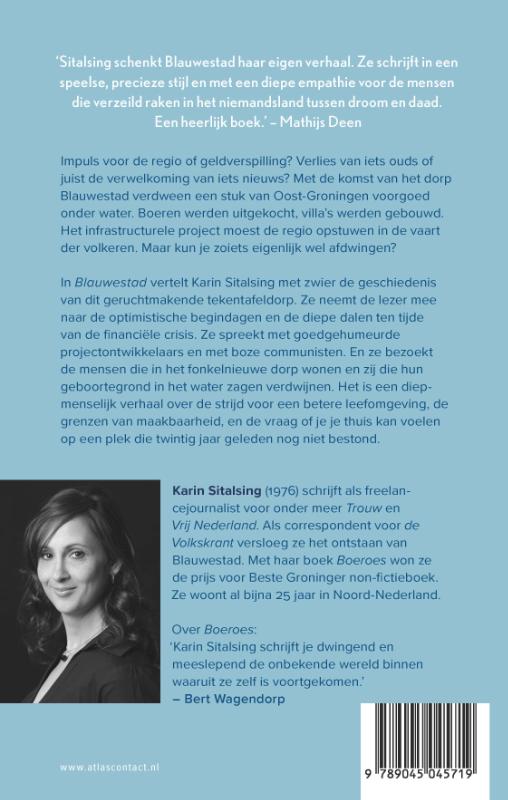 In Blauwestad vertelt journalist Karin Sitalsing de geschiedenis van dit geruchtmakende tekentafeldorp. Ze neemt de lezer mee naar de optimistische begindagen en de diepe dalen ten tijde van de financiële crisis. Ze spreekt met goedgehumeurde projectontwikkelaars en met boze communisten. En ze bezoekt de mensen die in het fonkelnieuwe dorp wonen en zij die hun geboortegrond in het water zagen verdwijnen. Blauwestad is een verhaal over de menselijke strijd voor een betere leefomgeving, de pogingen het land naar onze hand te zetten en de vraag of je je thuis kan voelen op een plek die twintig jaar geleden nog niet bestond.