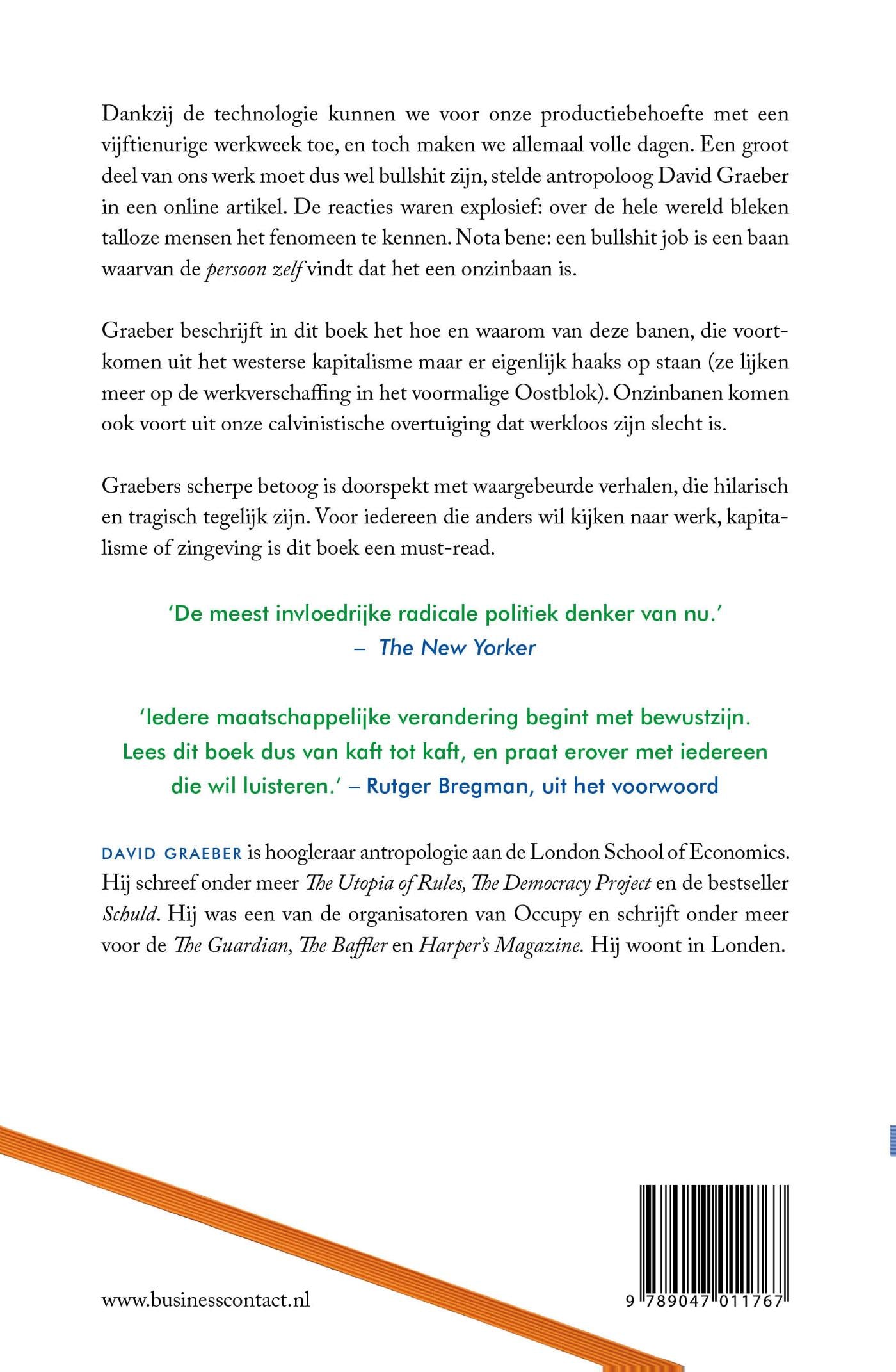 Graeber beschrijft in dit boek het hoe en waarom van deze banen, die voortkomen uit het westerse kapitalisme maar er eigenlijk haaks op staan (ze lijken meer op de werkverschaffing in het voormalige Oostblok). Onzinbanen komen ook voort uit onze calvinistische overtuiging dat werkloos zijn slecht is. Zijn scherpe betoog is doorspekt met waargebeurde verhalen, die hilarisch en tragisch tegelijk zijn.