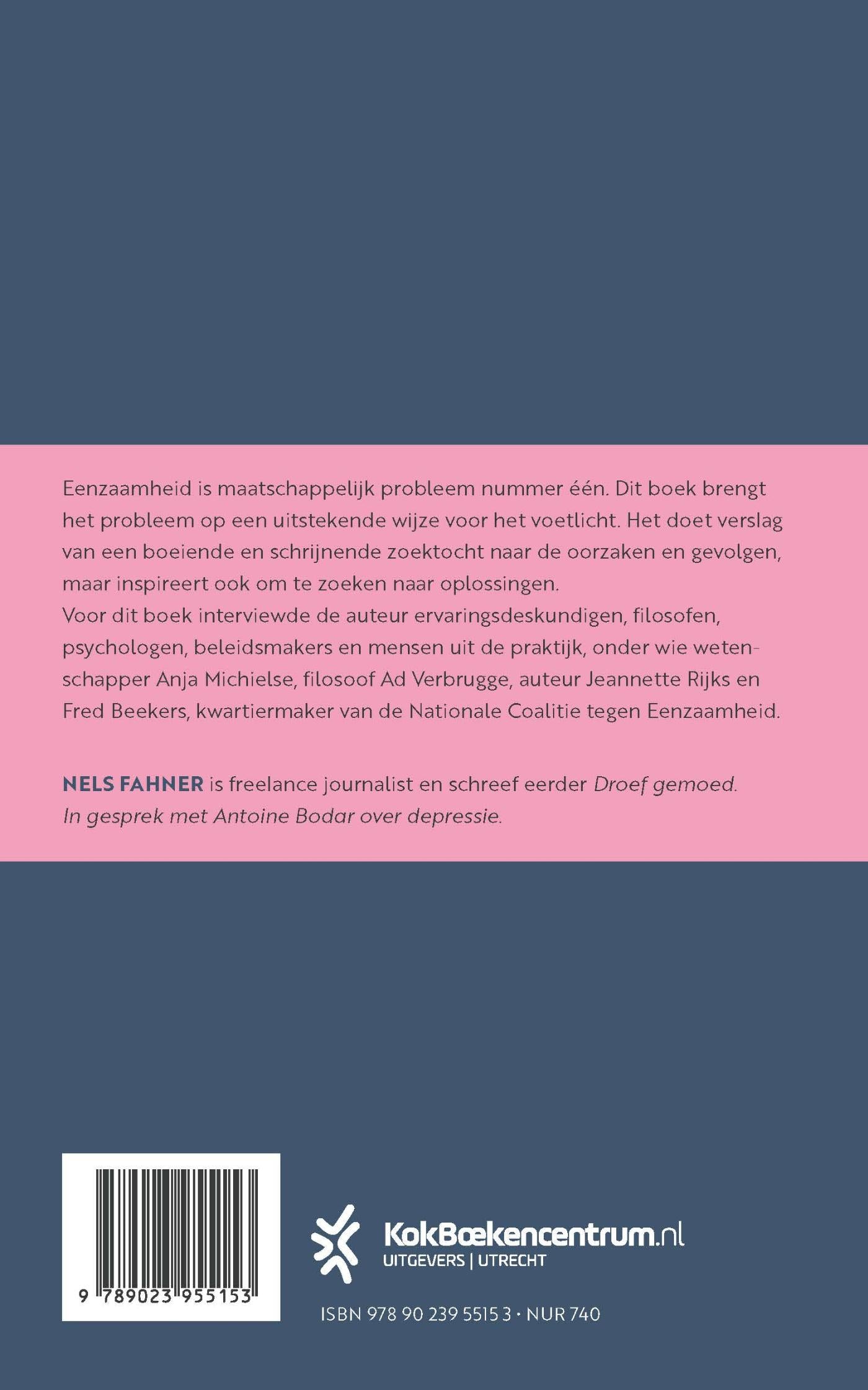 Eenzaam van Nels Fahner brengt het grote maatschappelijke probleem van eenzaamheid voor het voetlicht. Het doet verslag van een boeiende en schrijnende zoektocht naar de oorzaken en gevolgen, maar inspireert ook om te zoeken naar oplossingen. Voor dit boek interviewde de auteur ervaringsdeskundigen, filosofen, psychologen, beleidsmakers en mensen uit de praktijk, onder wie wetenschapper Anja Michielse, filosoof Ad Verbrugge en leken-benedictijn Wil Derkse.
