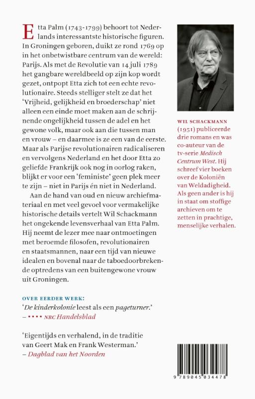 In ‘Etta Palm’ vertelt Wil Schackmann, met veel gevoel voor historische details, het levensverhaal van Etta Palm (1743-1799). Zij behoort tot Nederlands interessantste historische figuren. In Groningen geboren, duikt ze rond 1769 op in het onbetwistbare centrum van de wereld: Parijs. Als met de Revolutie van 14 juli 1789 het wereldbeeld radicaal verandert, wordt Etta een echte revolutionaire. Ze stelt dat het ‘Vrijheid, gelijkheid en broederschap’ niet alleen een einde moet maken aan de ongelijkheid tussen de adel en het gewone volk, maar ook aan die tussen man en vrouw. Maar als Parijse revolutionairen radicaliseren en vervolgens Nederland en het door Etta zo geliefde Frankrijk ook nog in oorlog raken, blijkt er voor een ‘feministe’ geen plek meer te zijn. Schackmann neemt de lezer mee naar ontmoetingen met beroemde filosofen, revolutionairen en staatsmannen, naar een tijd van nieuwe idealen en bovenal naar de taboedoorbrekende optredens van een buitengewone vrouw uit Groningen.