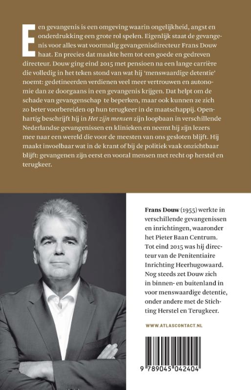 ‘Het zijn mensen’ is het verhaal van Frans Douw over het gevangeniswezen. Een gevangenis is een omgeving waarin ongelijkheid, angst en onderdrukking een grote rol spelen. Eigenlijk staat de gevangenis voor alles wat voormalig gevangenisdirecteur Frans Douw haat. En precies dat maakte hem tot een gedreven mensen-directeur. Douw ging eind 2015 met pensioen na een lange carrière die volledig in het teken heeft gestaan van wat hij ‘menswaardige detentie’ noemt: gedetineerden verdienen veel meer vertrouwen en autonomie dan ze doorgaans in een gevangenis krijgen. Dat helpt om de schade van detentie te beperken, maar ook kunnen ze zich zo beter voorbereiden op hun terugkeer in de maatschappij. Openhartig en met vaardige pen beschrijft hij in ‘Het zijn mensen’ zijn loopbaan in verschillende Nederlandse gevangenissen en klinieken en neemt hij zijn lezers mee naar een wereld die voor de meesten van ons gesloten blijft. Hij maakt invoelbaar wat in de krant of bij de politiek vaak onzichtbaar blijft: gevangenen zijn eerst en vooral mensen met recht op herstel en terugkeer.