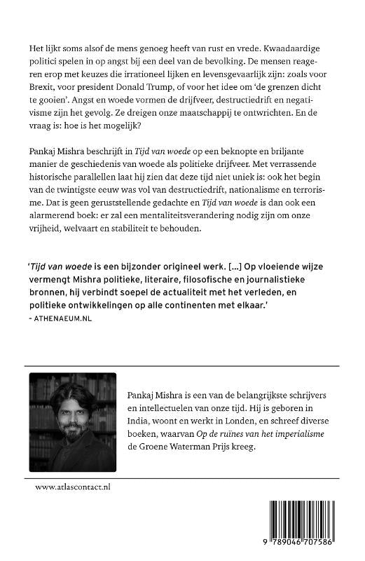 Pankaj Mishra beschrijft in ‘Tijd van woede’ op een beknopte en briljante manier de geschiedenis van woede als politieke drijfveer. Met verrassende historische parallellen laat hij zien dat deze tijd niet uniek is: ook het begin van de twintigste eeuw was vol van destructiedrift, nationalisme en terrorisme. Dat is geen geruststellende gedachte en ‘Tijd van woede’ is dan ook een alarmerend boek: er zal een mentaliteitsverandering nodig zijn om onze vrijheid, welvaart en stabiliteit te behouden.