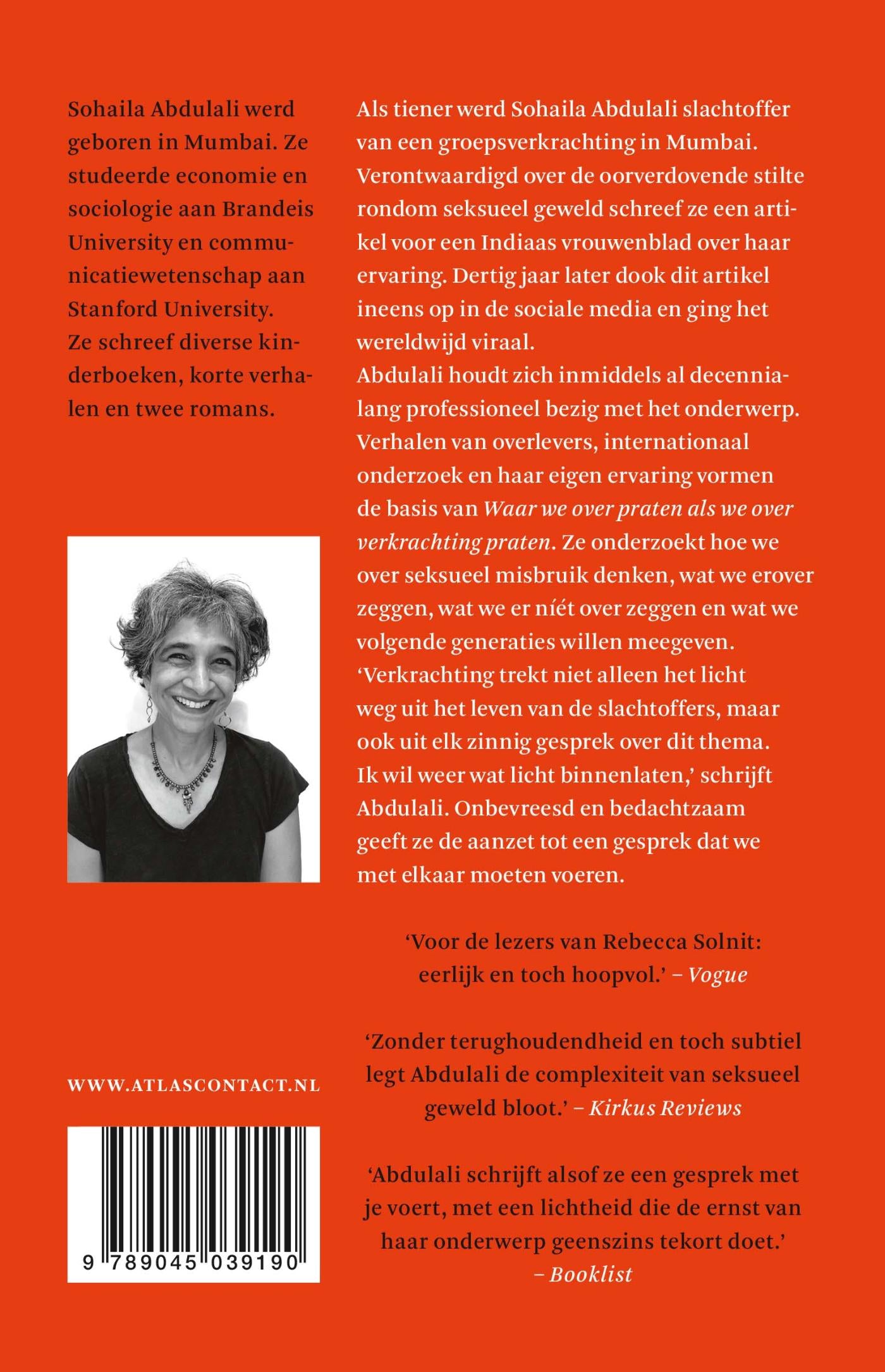 In ‘Waar we over praten als we over verkrachting praten’ doorbreekt Sohaila Abdulali de oorverdovende stilte rondom seksueel geweld. Abdulali vertelt de verhalen van overlevers en bespreekt internationaal onderzoek, ze vertrekt hierbij vanuit haar eigen ervaring. Als tiener werd Abdulali slachtoffer van een groepsverkrachting in Mumbai. Verontwaardigd over het gebrek aan aandacht voor dit thema schreef ze een artikel voor een Indiaas vrouwenblad over haar ervaring. Dertig jaar later dook dit artikel ineens op in de sociale media en ging het wereldwijd viraal. Abdulali houdt zich inmiddels al decennialang professioneel bezig met het onderwerp.