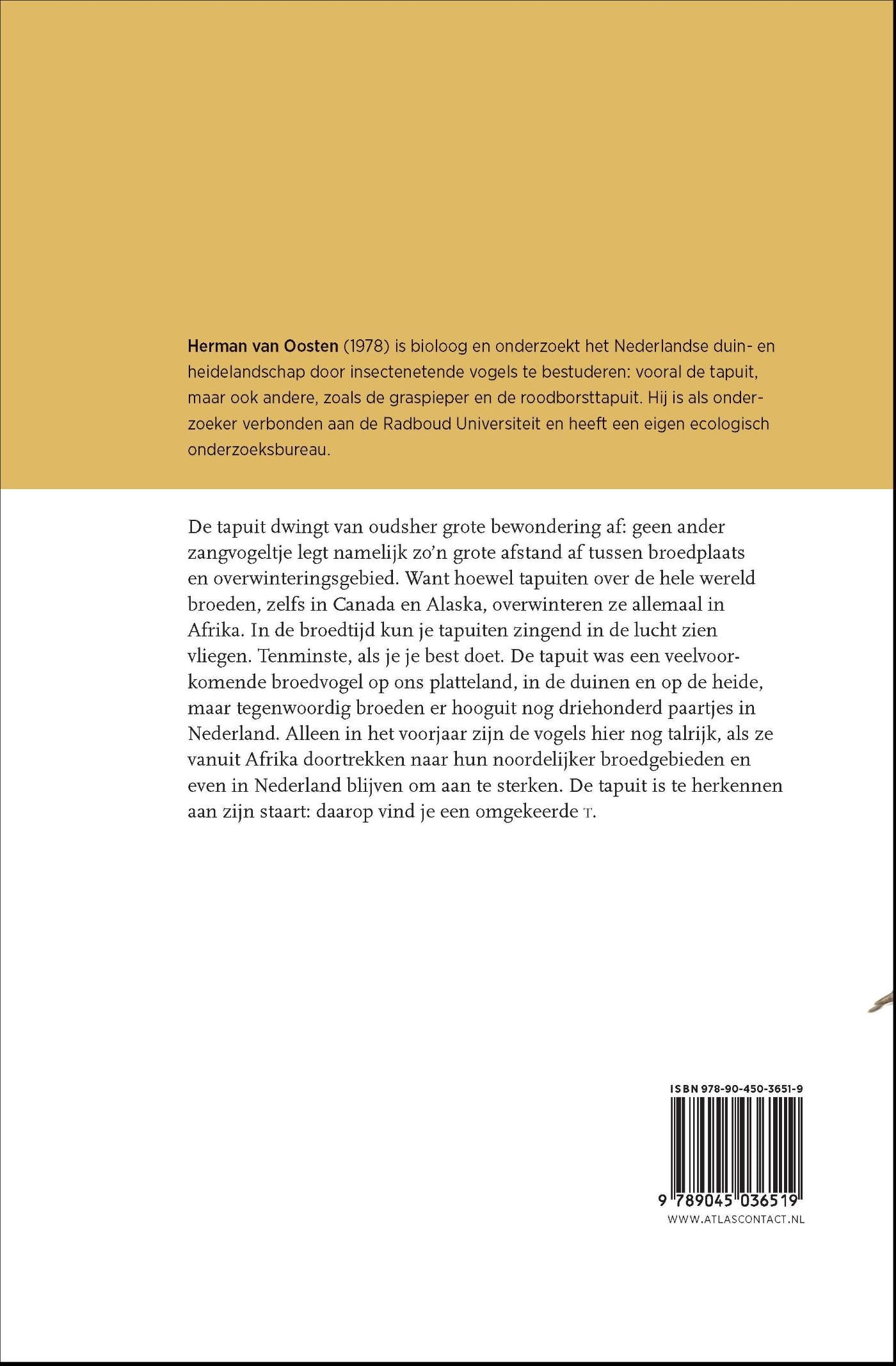 De tapuit dwingt van oudsher grote bewondering af: geen ander zangvogeltje legt namelijk zo’n grote afstand af tussen broedplaats en overwinteringsgebied. Want hoewel tapuiten over de hele wereld broeden, zelfs in Canada en Alaska, overwinteren ze allemaal in Afrika. In de broedtijd kun je tapuiten zingend in de lucht zien vliegen. Tenminste, als je je best doet. De tapuit was een veelvoorkomende broedvogel op ons platteland, in de duinen en op de heide, maar tegenwoordig broeden er hooguit nog driehonderd paartjes in Nederland. Alleen in het voorjaar zijn de vogels hier nog talrijk, als ze vanuit Afrika doortrekken naar hun noordelijker broedgebieden en even in Nederland blijven om aan te sterken. De tapuit is te herkennen aan zijn staart: daarop vind je een omgekeerde T.