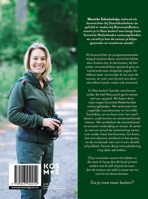 Marieke Schatteleijn, bekend als boswachter bij Staatsbosbeheer én geliefd tv-maker bij BinnensteBuiten, neemt je in Naar buiten! mee langs haar favoriete Nederlandse natuurgebieden en vertelt je hoe de natuur je blijer, gezonder en creatiever maakt.