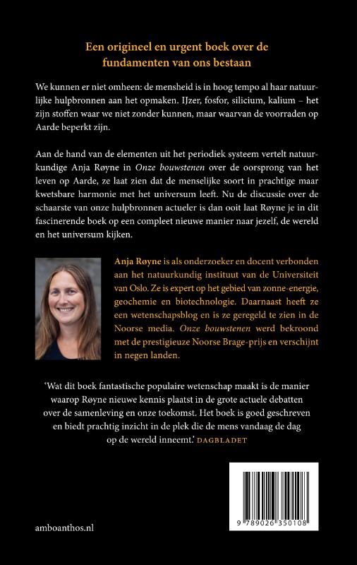 Aan de hand van de elementen uit het periodiek systeem legt Anja Røyne in Onze bouwstenen de oorsprong van het leven op aarde bloot en laat ze zien dat de menselijke soort in een prachtige maar kwetsbare harmonie met het universum leeft. IJzer, fosfor, silicium, kalium – het zijn stoffen waar we niet zonder kunnen, maar de voorraden natuurlijke hulpbronnen waarover de aarde beschikt zijn niet onbeperkt. We moeten er dus spaarzaam mee omgaan.