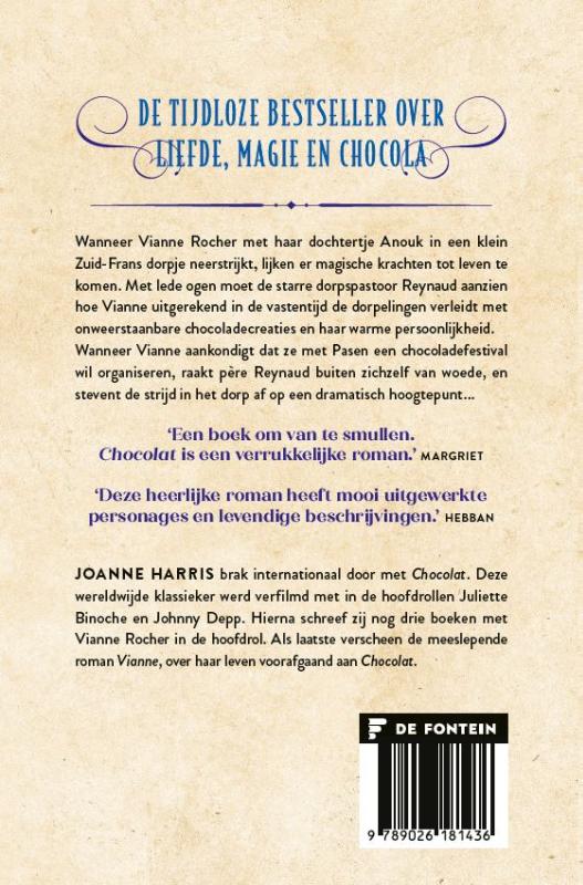 Sinds haar internationale doorbraak met Chocolat, dat in 2001 uitkwam als film met Juliette Binoche en Johnny Depp in de hoofdrollen, schreef Joanne Harris vijf boeken met Vianne in de hoofdrol: de bestsellers Chocolat, Rode schoenen, De zoetheid van perziken en De aardbeiendief, en de prequel Vianne, over haar leven vóór ze een chocoladewinkel opende…