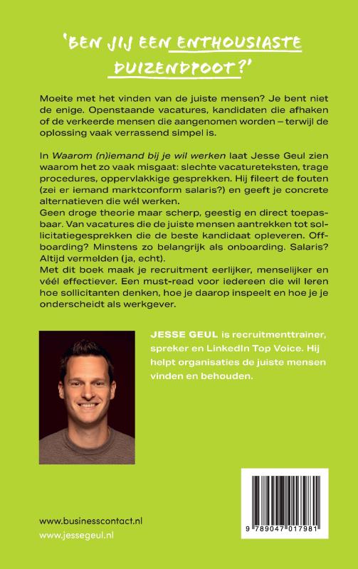 In dit boek laat Jesse Geul zien waarom het zo vaak misgaat: slechte vacatureteksten, trage procedures, oppervlakkige gesprekken. Hij fileert de fouten (zei er iemand marktconform salaris?) en geeft je concrete alternatieven die wél werken. Geen droge theorie maar scherp, geestig en direct toepasbaar. Van vacatures die de juiste mensen aantrekken tot sollicitatiegesprekken die de beste kandidaat opleveren. Offboarding? Minstens zo belangrijk als onboarding. Salaris? Altijd vermelden (ja, echt). Met dit boek maak je recruitment eerlijker, menselijker en véél effectiever. Een must-read voor iedereen die wil leren hoe sollicitanten denken, hoe je daarop inspeelt en hoe je je onderscheidt als werkgever.