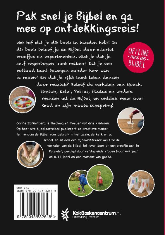 In ‘Ik ben een Bijbelontdekker’ van Corine Zonnenberg ontdekken kinderen de Bijbel aan de hand van experimentjes en opdrachten. De proefjes kunnen ze samen met volwassenen uitvoeren. Na het doen van een opdracht of proefje (ervaren), volgt het Bijbelverhaal (lezen), waarna er ruimte is voor gesprek en het opschrijven van gebedspunten (doorpraten). Maak de regenboog van Noach, bak brood en laat water in wijn veranderen. De materialen zijn alledaags en de opdrachten zijn makkelijk voor te bereiden. Door de leeftijdsdifferentiatie is het boek te gebruiken door kinderen van 4 tot 12 jaar. Een mooie manier van geloofsopvoeding die de Bijbelverhalen tot leven wekt.