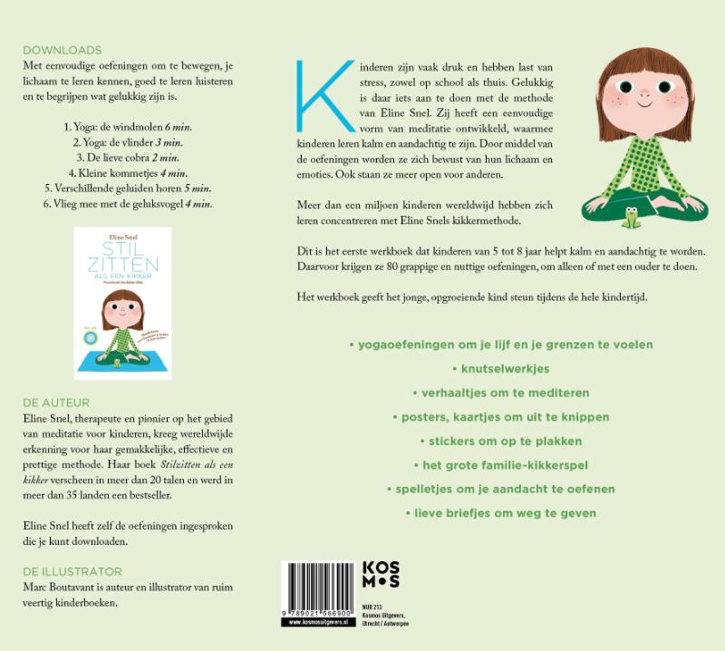 Eline Snel komt na 'Stilzitten als een kikker' met een follow-up: het 'Werkboek stilzitten als een kikker'. Dit is het eerste werkboek voor kinderen van 5 tot 8 jaar om zich te concentreren door middel van de methode van de kikker. Het bevat 80 grappige en nuttige activiteiten om alleen of met een ouder te doen om rust en stilte te vinden.