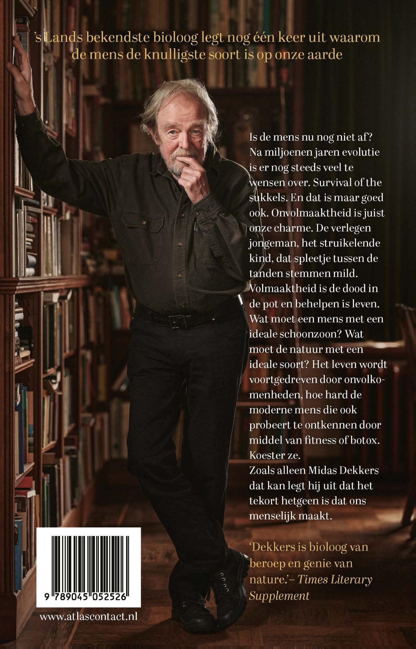 Is de mens nu nog niet af? Na miljoenen jaren evolutie is er nog steeds veel te wensen over. Survival of the sukkels. En dat is maar goed ook. Onvolmaaktheid is juist onze charme. De verlegen jongeman, het struikelende kind en dat spleetje tussen de tanden stemmen mild. Volmaaktheid is de dood in de pot en behelpen is leven. Wat moet een mens met een ideale schoonzoon? Wat moet de natuur met een ideale soort? Het leven wordt voortgedreven door onvolkomenheden, hoe hard de moderne mens die ook probeert te ontkennen door middel van fitness of botox. Koester ze. Zoals alleen Midas Dekkers dat kan legt hij uit dat het tekort hetgeen is dat ons menselijk maakt.