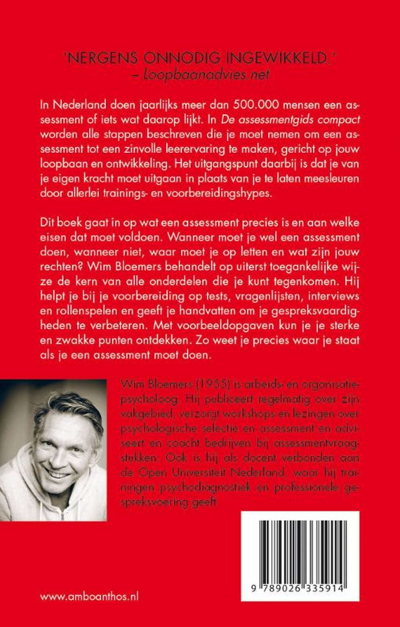 Arbeids- en organisatiepsycholoog Wim Bloemers’ ‘De assessmentgids compact’ beschrijft alle noodzakelijke stappen die je moet nemen om een assessment tot een zinvolle leerervaring te maken, gericht op jouw loopbaan en ontwikkeling. Het gaat in op wat een assessment precies is en aan welke eisen het moet voldoen. Wat wordt er tijdens een assessmentprocedure van je verwacht en wat zijn jouw rechten? Bloemers geeft voorbeeldopgaven om je voor te bereiden op tests, vragenlijsten, interviews en rollenspelen en biedt handvatten om je gespreksvaardigheden te verbeteren.