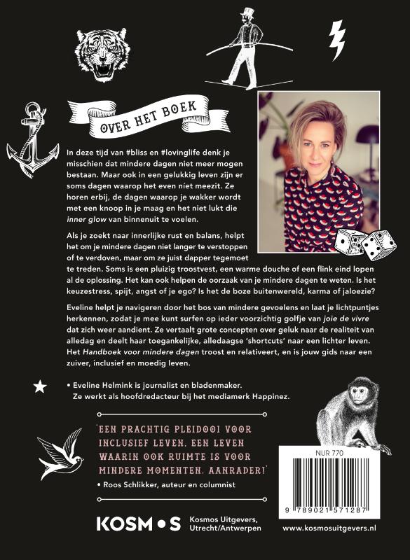 In ‘Handboek voor mindere dagen’ vertelt de hoofdredacteur van Happinez, Eveline Helmink, wat zij doet op dagen dat alles tegen zit. In deze tijd, waarin iedereen alleen maar de leuke dingen deelt, vergeten we bijna dat we ook dagen meemaken die gewoon stom zijn. En dit zijn juist de dagen die je het meeste over jezelf leren. Het is de les der lessen: het accepteren van en meebewegen met het leven zoals het is.