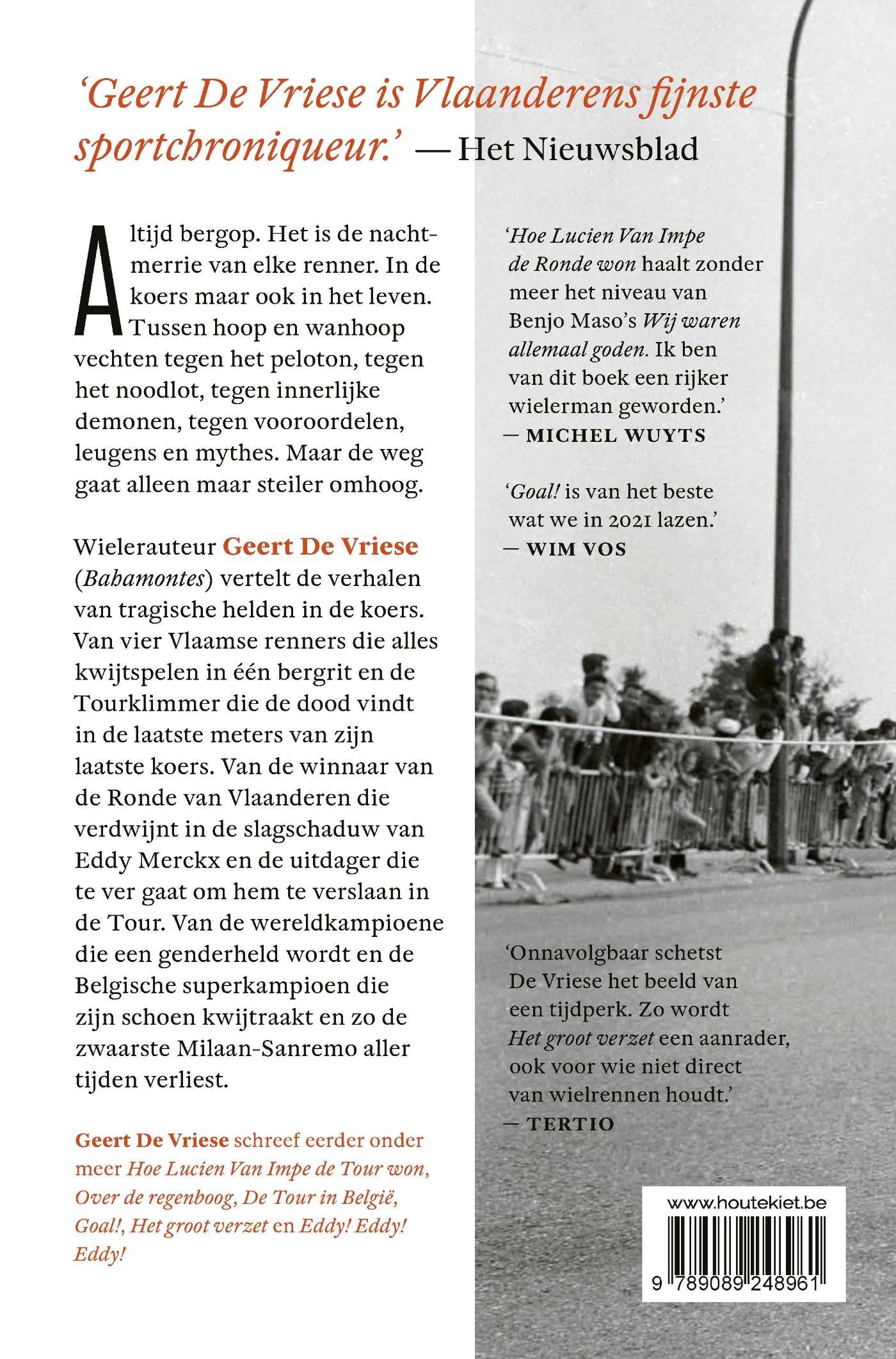 Wielerauteur Geert De Vriese (Bahamontes) vertelt de verhalen van tragische helden in de koers. Van vier Vlaamse renners die alles kwijtspelen in één bergrit en de Tourklimmer die de dood vindt in de laatste meters van zijn laatste koers. Van de winnaar van de Ronde van Vlaanderen die verdwijnt in de slagschaduw van Eddy Merckx en de uitdager die te ver gaat om hem te verslaan in de Tour. Van de wereldkampioene die een genderheld wordt en de Belgische superkampioen die zijn schoen kwijtraakt en zo de zwaarste Milaan-Sanremo aller tijden verliest