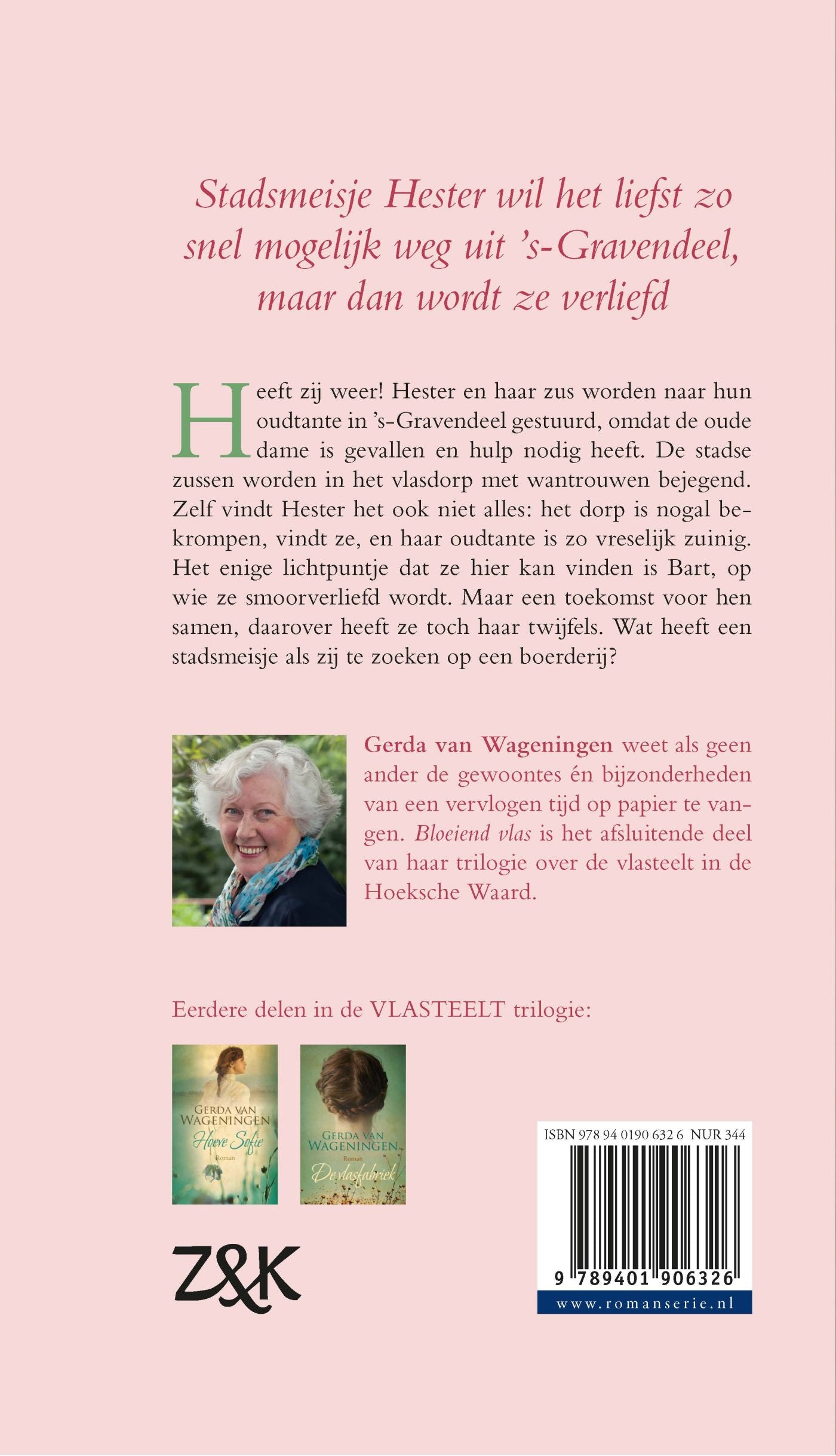 Gerda van Wageningen weet als geen ander de gewoontes en bijzonderheden van een vervlogen tijd op papier te vangen. Bloeiend vlas is het laatste deel van een trilogie die de auteur schreef tegen de achtergrond van de vlasteelt in de Hoeksche Waard. De eerdere delen zijn Hoeve Sofie en De vlasfabriek.