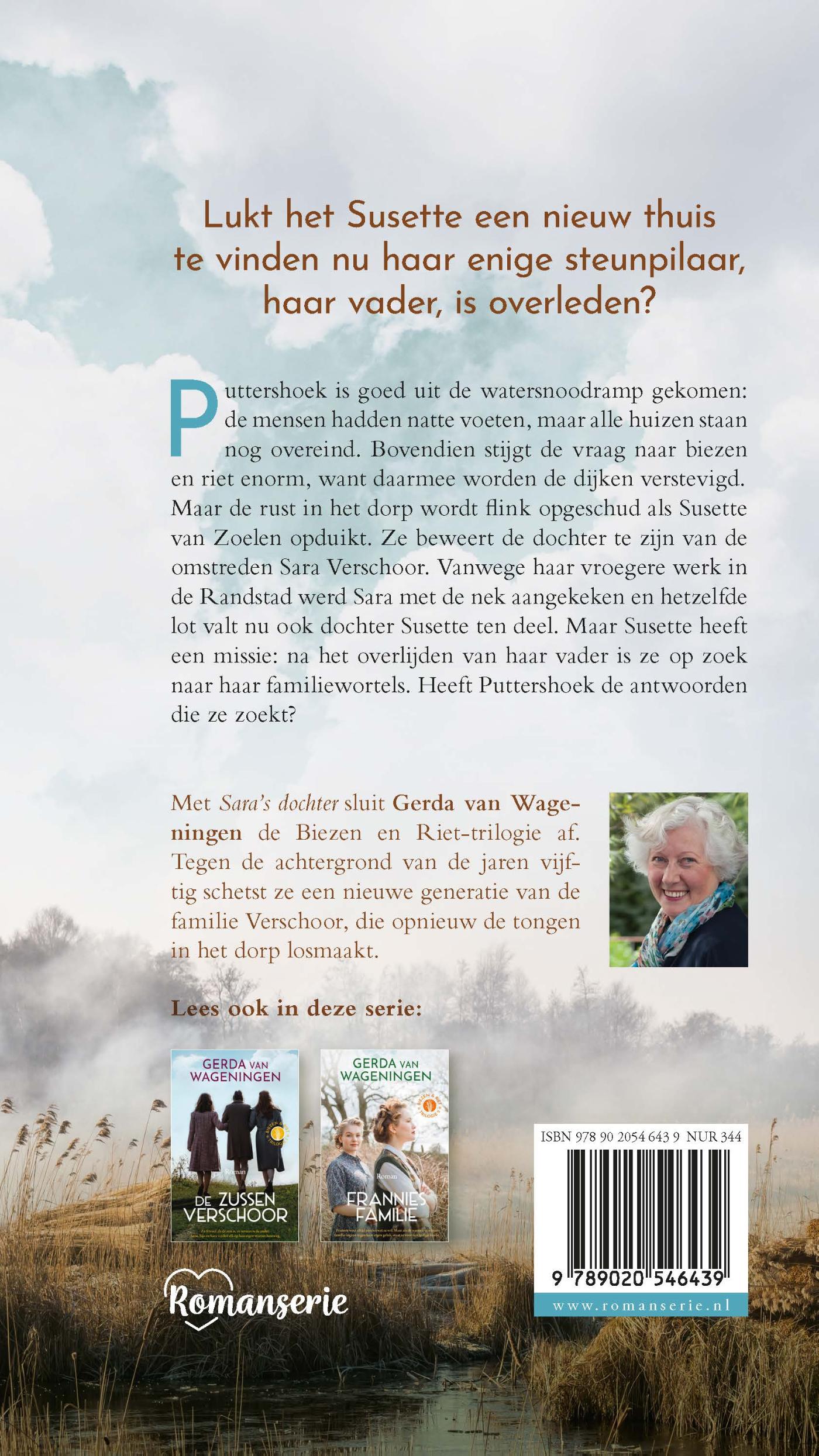 'Sara's dochter' is het derde en laatste deel van de Biezen en riet-trilogie van Gerda van Wageningen. Lees ook de verhalen over de twee voorgaande generaties in 'De zussen Verschoor' en 'Frannies familie'.