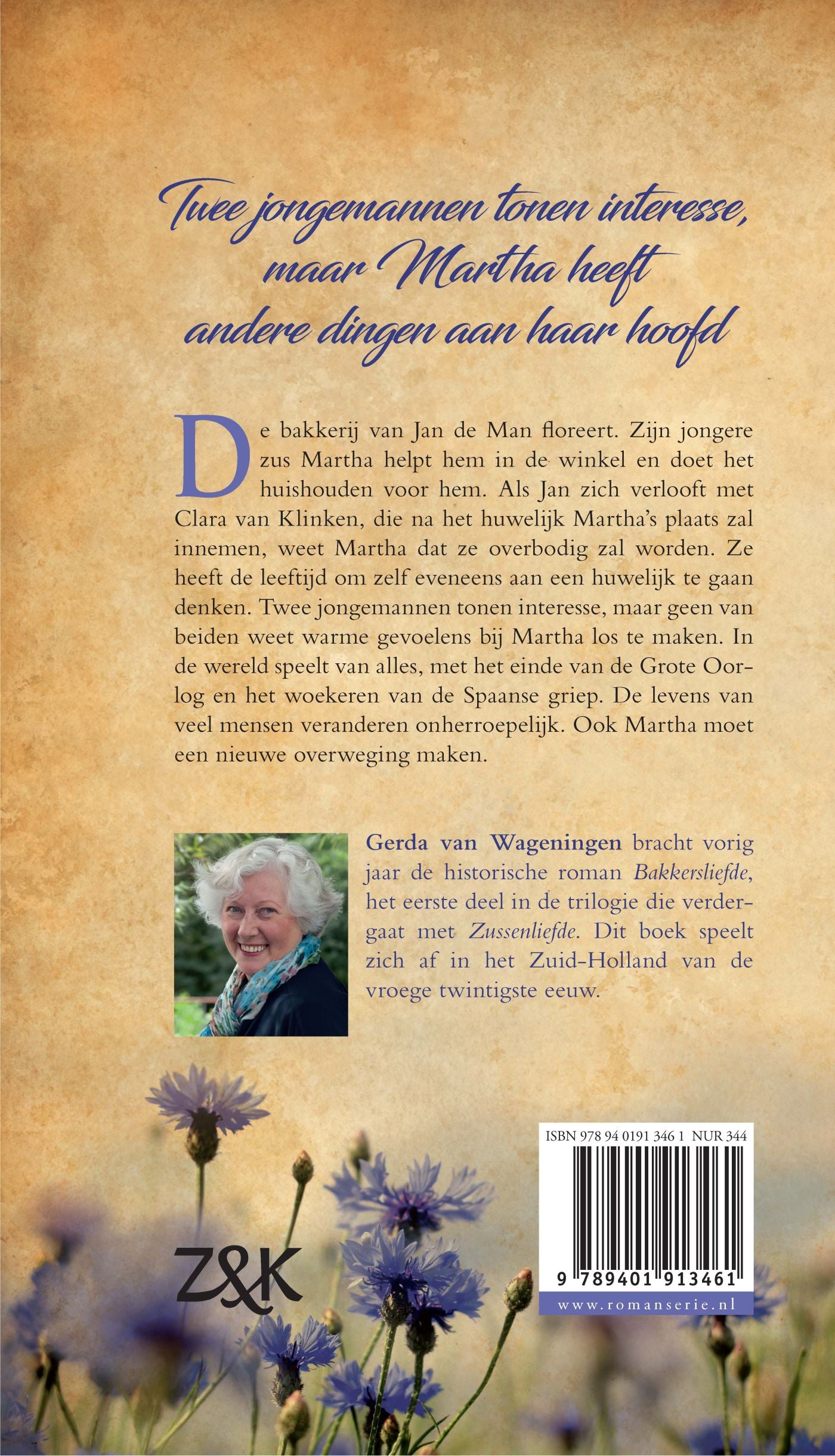 'Zussenliefde' van Gerda van Wageningen neemt je meen aar Oud-Beijerland, 1918. De bakkerij van Jan de Man floreert. Zijn zus Martha helpt hem in de winkel en in het huishouden. Maar wanneer Jan zich verlooft, wordt Martha overbodig. Zelf heeft ze trouwens ook de leeftijd om aan een huwelijk te gaan denken. Meerdere mannen tonen interesse, maar geen van hen weet warme gevoelens bij haar los te maken. Dan ineens grijpt de Spaanse griep om zich heen in het dorp, met veel doden tot gevolg. 'Zussenliefde' is na 'Bakkersliefde' het tweede deel in de bakkerstrilogie van Gerda van Wageningen.