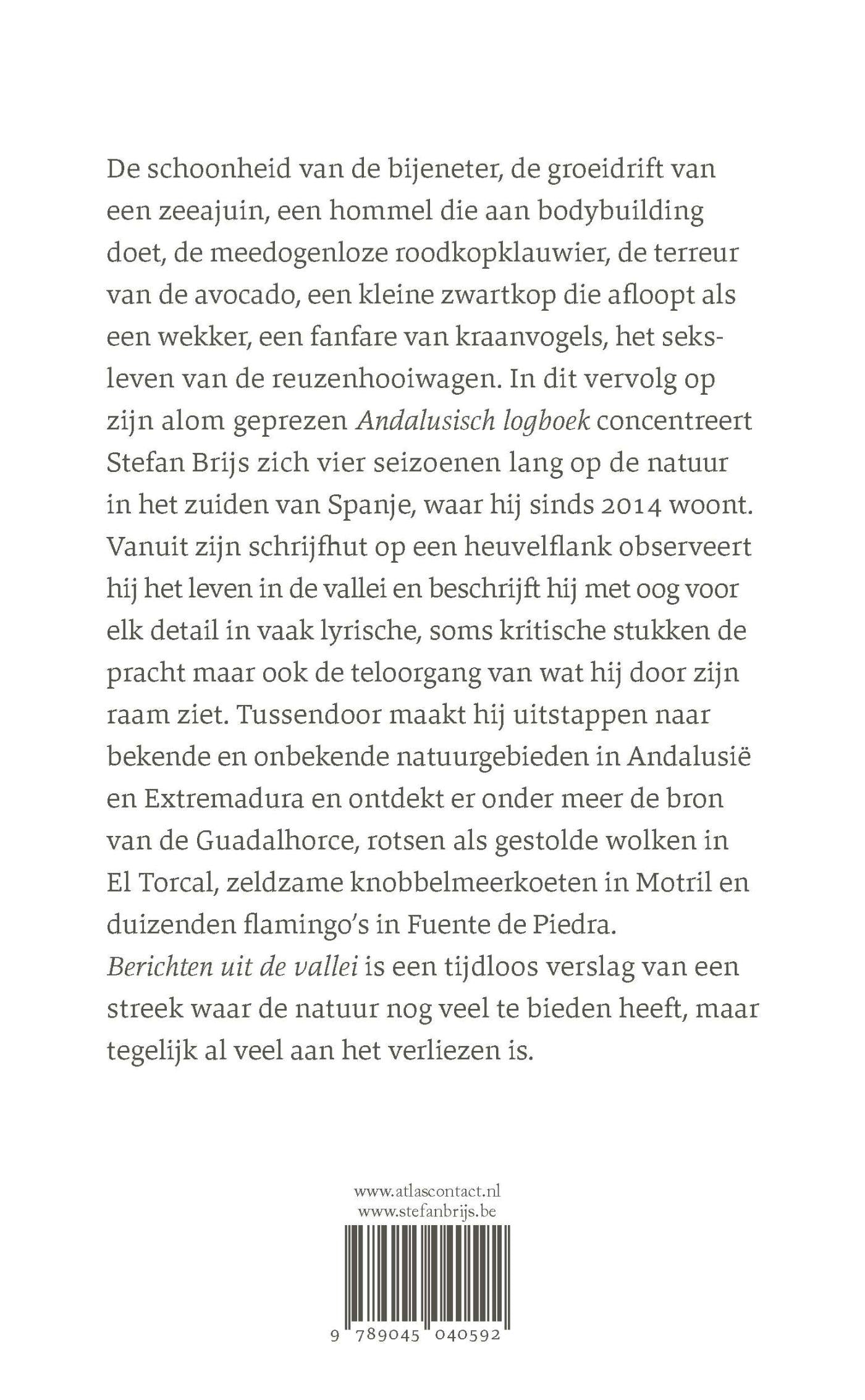 ‘Berichten uit de vallei’ van Stefan Brijs is een tijdloos verslag van een streek waar de natuur nog veel te bieden heeft, maar tegelijk al veel aan het verliezen is. In dit vervolg van het alom geprezen ‘Andalusisch logboek’ concentreert Brijs zich in vier seizoenen lang op de natuur in het zuiden van Spanje, waar hij sinds 2014 woont. Vanuit zijn schrijfhut op een heuvelflank observeert hij het leven in de vallei en beschrijft hij met oog voor elk detail in vaak lyrische, soms kritische stukken de pracht maar ook de teloorgang van wat hij door zijn raam ziet.