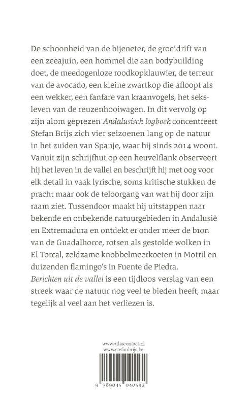‘Berichten uit de vallei’ van Stefan Brijs is een tijdloos verslag van een streek waar de natuur nog veel te bieden heeft, maar tegelijk al veel aan het verliezen is. In dit vervolg van het alom geprezen ‘Andalusisch logboek’ concentreert Brijs zich in vier seizoenen lang op de natuur in het zuiden van Spanje, waar hij sinds 2014 woont. Vanuit zijn schrijfhut op een heuvelflank observeert hij het leven in de vallei en beschrijft hij met oog voor elk detail in vaak lyrische, soms kritische stukken de pracht maar ook de teloorgang van wat hij door zijn raam ziet.
