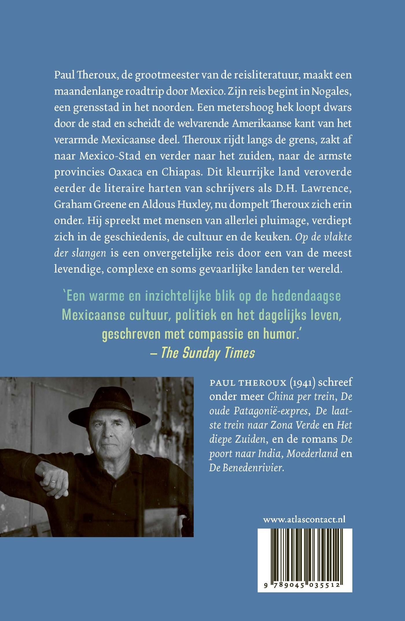 In ‘Op de vlakte der slangen’ maakt Paul Theroux, grootmeester van de reisliteratuur, een maandenlange roadtrip door Mexico. Theroux begint in Nogales, een grensstad in het noorden. Een metershoog hek loopt dwars door de stad en scheidt de welvarende Amerikaanse kant van het verarmde Mexicaanse deel. Vervolgens rijdt hij langs de grens, zakt af naar Mexico-Stad en verder naar het zuiden, naar de armste provincies Oaxaca en Chiapas. Hij spreekt met mensen van allerlei pluimage, verdiept zich in de geschiedenis, de cultuur en de keuken. Het wordt een onvergetelijke reis door een van de meest levendige, complexe en soms gevaarlijkste land ter wereld.