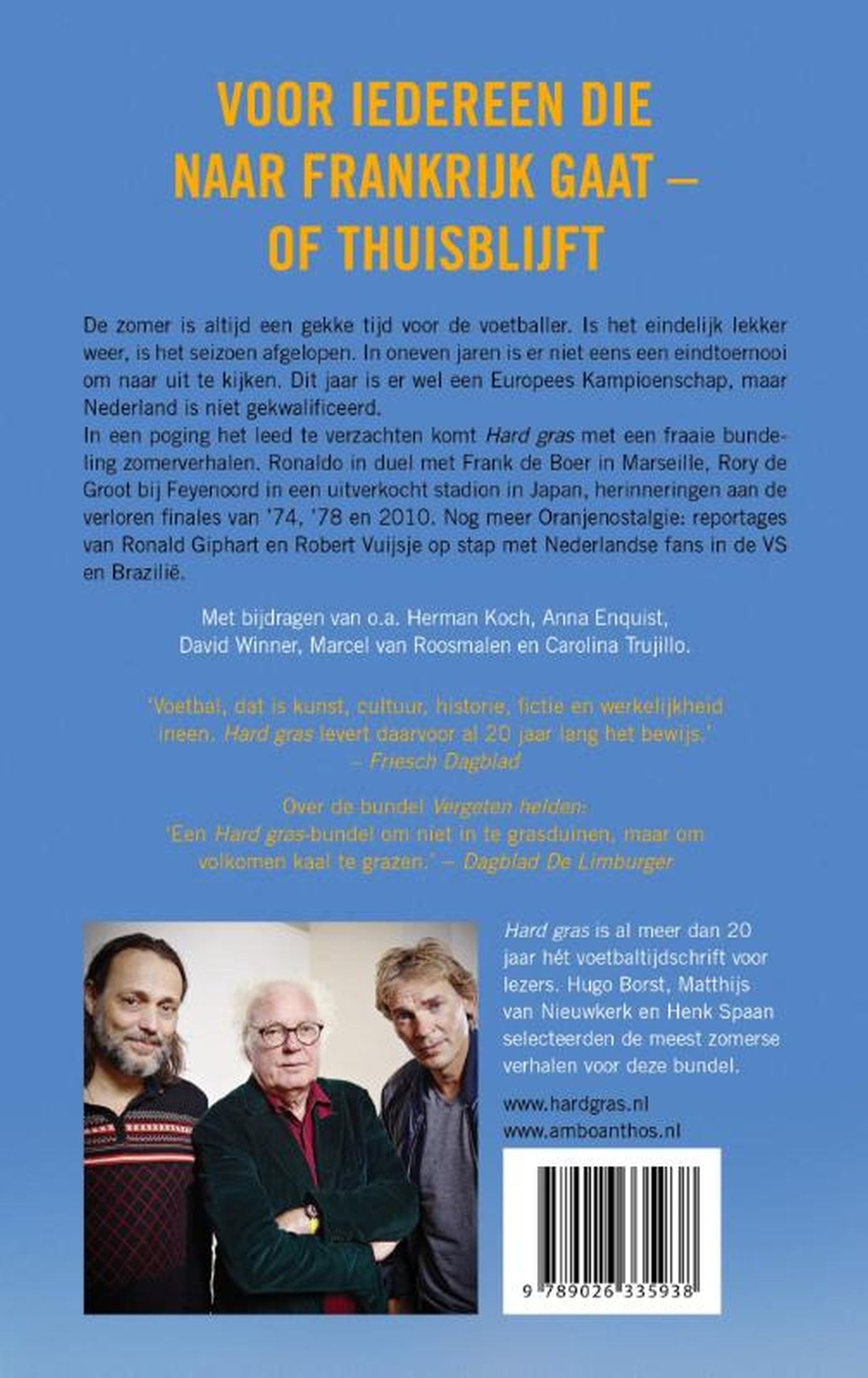 De grote Hard Gras Zomerbundel, met – geselecteerd door Hugo Borst, Matthijs van Nieuwkerk en Henk Spaan – verhalen van o.a. Herman Koch, Anna Enquist, David Winner, Marcel van Roosmalen en Carolina Trujillo, is voor alle voetballers die droeftoeteren dat Nederland niet gekwalificeerd is voor het EK. In een poging het leed te verzachten komt Hard gras met de mooiste voetbal- zomerverhalen: Ronaldo in duel met Frank de Boer in Marseille, Rory de Groot bij Feyenoord in een uitverkocht stadion in Japan, herinneringen aan de verloren finales van ’74, ’78 en 2010… En nog meer Oranjenostalgie: reportages van Ronald Giphart en Robert Vuijsje op stap met Nederlandse fans in de VS en Brazilië. Zo komen we de zomer wel door.