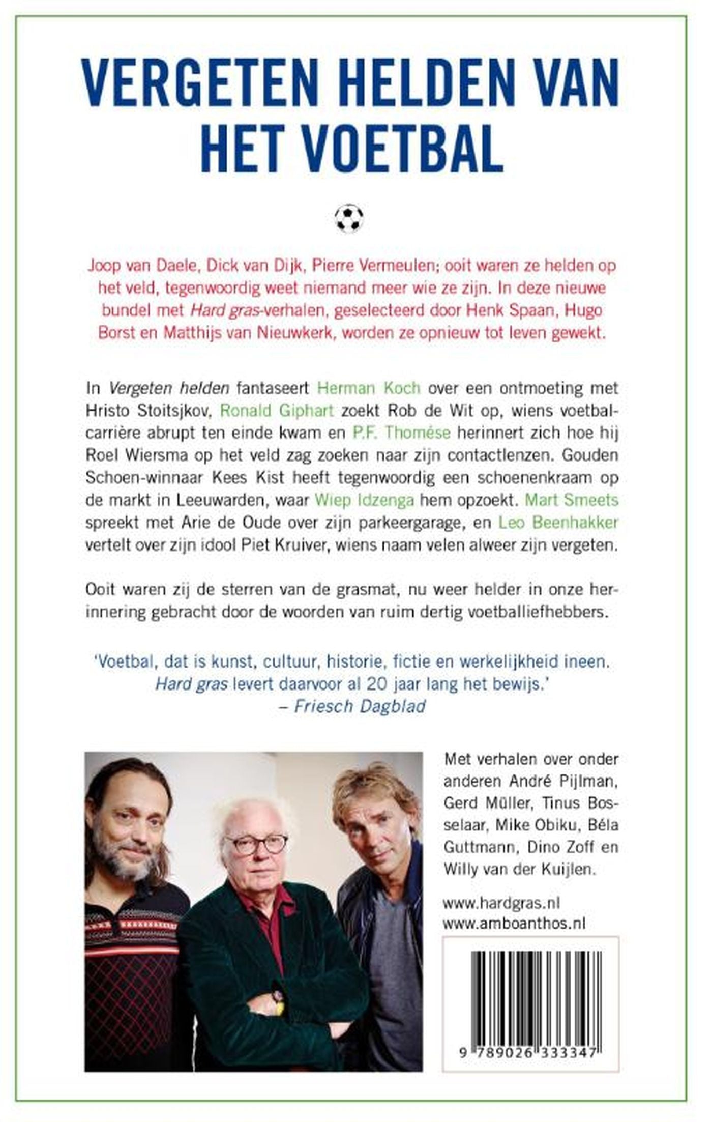 Joop van Daele, Dick van Dijk, Pierre Vermeulen; ooit waren ze helden op het voetbalveld, tegenwoordig weet niemand meer wie ze zijn. In Vergeten helden, een nieuwe bundel met verhalen uit voetbaltijdschrift Hard gras, geselecteerd door Henk Spaan, Hugo Borst en Matthijs van Nieuwkerk, worden ze opnieuw tot leven gewekt. Herman Koch fantaseert over een ontmoeting met Hristo Stoitsjkov, Ronald Giphart zoekt Rob de Wit op, wiens voetbalcarrière abrupt ten einde kwam en P.F. Thomése herinnert zich hoe hij Roel Wiersma op het veld zag zoeken naar zijn contactlenzen. Gouden Schoenwinnaar Kees Kist heeft tegenwoordig een schoenenkraam op de markt in Leeuwarden, waar Wiep Idzenga hem opzoekt. Leo Beenhakker vertelt over zijn idool Piet Kruiver, wiens naam velen alweer zijn vergeten. Ooit waren zij de sterren van de grasmat, nu worden deze vergeten helden weer helder in onze herinnering gebracht door de verhalen uit Hard Gras.