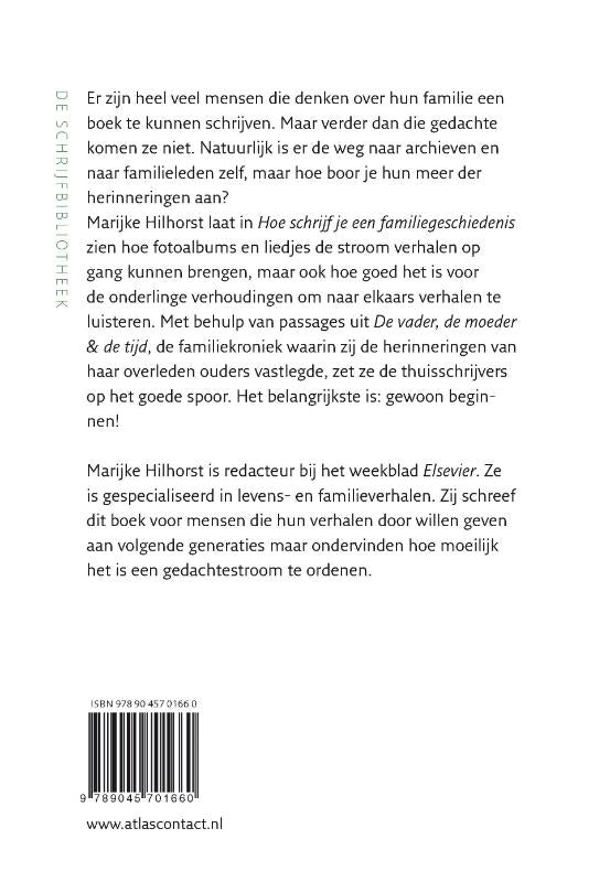Marijke Hilhorst laat in 'Hoe schrijf je een familiegeschiedenis' zien hoe je gebeurtenissen uit je familieverleden zo helder en vooral zo beeldend mogelijk kunt opschrijven. Er zijn heel veel mensen die graag een boek over hun familie zouden willen schrijven. Maar verder dan die gedachte komen ze vaak niet. Mensen die hun verhalen door willen geven aan volgende generaties ondervinden telkens weer hoe moeilijk het is een gedachtestroom te ordenen. Natuurlijk is er de weg naar archieven en naar familieleden zelf, maar hoe boor je hun 'meer der herinneringen' aan? Fotoalbums en liedjes kunnen de stroom verhalen op gang brengen, maar het toeval in de vorm van verhuizing of opruiming van de zolder in het ouderlijk huis kan ook een rol spelen. Marijke Hilhorst zet de thuisschrijvers op het goede spoor. Het belangrijkste is: gewoon beginnen!