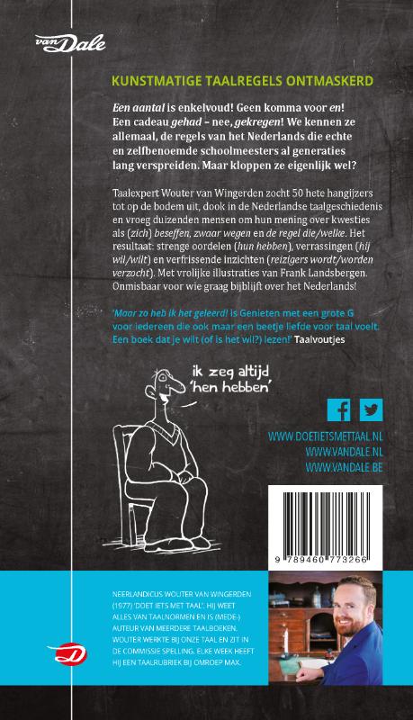 'Een aantal is enkelvoud!' 'Geen komma voor en!' Regels die echte en zelfbenoemde schoolmeesters al generaties lang verspreiden. Maar kloppen ze wel? Taalexpert Wouter van Wingerden zocht 50 hete hangijzers tot op de bodem uit én vroeg mensen om hun oordeel. De uitkomst: strenge oordelen (hun hebben), nuance (je kan, zwaar wegen), nieuwe inzichten (reizigers worden verzocht) en verrassingen: hij wilt en de data is komen onstuimig op.