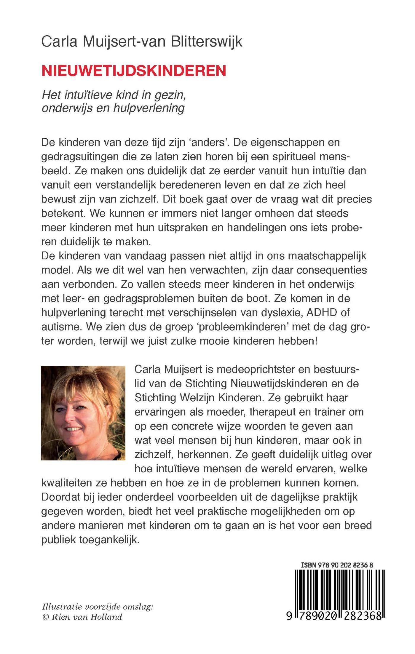 Carla Muijsert is medeoprichtster en bestuurslid van het Platform Nieuwetijdskinderen. Ze gebruikt haar ervaringen als moeder, therapeut en woordvoerder van het Platform om op een concrete wijze woorden te geven aan wat veel mensen bij hun kinderen, maar ook in zichzelf, herkennen. Ze geeft duidelijk uitleg over hoe intuïtieve mensen de wereld ervaren, welke kwaliteiten ze hebben en hoe ze in de problemen kunnen komen. Doordat bij ieder onderdeel voorbeelden uit de dagelijkse praktijk gegeven worden, biedt het veel praktische mogelijkheden om op andere manieren met kinderen om te gaan en is het voor een breed publiek toegankelijk.