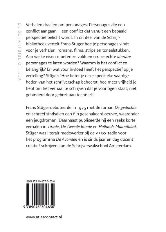 Verhalen draaien om personages. Personages die een conflict aangaan - een conflict dat vanuit een bepaald perspectief belicht wordt. In dit deel van de Schrijfbibliotheek vertelt Frans Stüger hoe je personages vindt voor je verhalen, romans, films, strips en toneelstukken. Aan welke eisen moeten ze voldoen om ze echte literaire personages te laten worden? Waarom is het conflict zo belangrijk? En wat voor invloed heeft het perspectief op je vertelling? Stüger: Hoe beter je deze specifieke vaardigheden van het schrijverschap beheerst, hoe meer vrijheid je hebt om het verhaal te schrijven dat je voor ogen staat; niet gehinderd door gebrek aan techniek.