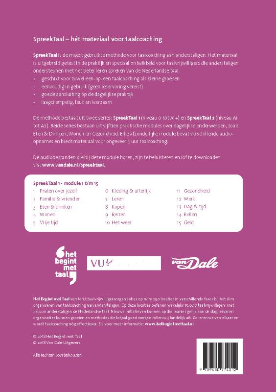 SpreekTaal is de meest gebruikte methode voor taalcoaching aan anderstaligen. Het materiaal is uitgebreid getest in de praktijk en speciaal ontwikkeld voor taalvrijwilligers die anderstaligen ondersteunen met het beter leren spreken van de Nederlandse taal.