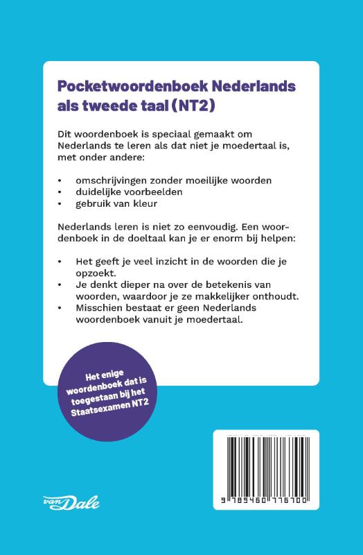 Dit Van Dale Pocketwoordenboek Nederlands als tweede taal (NT2) bevat de ruim 15.000 belangrijkste trefwoorden en 2.300 meest gebruikte uitdrukkingen uit het Nederlands. Dit woordenboek is speciaal gemaakt om Nederlands te leren als dat niet je moedertaal is. Door omschrijvingen zonder moeilijke woorden, duidelijke voorbeelden en gebruik van kleur is het een woordenboek waarmee iedereen slaagt. Het is nu volledig herzien met nieuwe woorden en definities zoals appgroep, tikkie en tutorial. Kortom, dit is hét woordenboek voor het NT2-onderwijs.