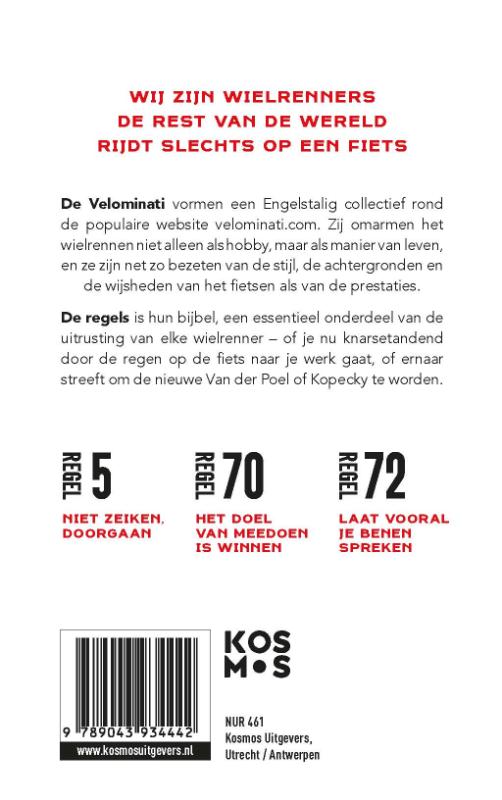 'De regels' is een luchtige, grappig geschreven gids voor iedere wielrenner: wat zou je moeten doen en wat kun je beter laten. De gids is samengesteld door de Velominati, een Engelstalig collectief van wielerliefhebbers, bekend van de zeer populaire website Velominati.com. Zij omarmen het wielrennen niet alleen als hobby, maar als een manier van leven, en zijn net zo bezeten van de stijl, de achtergronden en de wijsheden als van de prestaties.