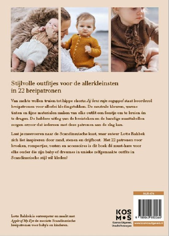 In 'Jij bent mijn oogappel' van Lotte Rahbek vind je de mooiste breiwerken voor baby’s en kinderen. Laat je inspireren door de prachtigste breipatronen voor trendy babykleding, variërend van zachte merinowollen shorts tot stijlvolle grofgebreide truitjes en schattige baby bonnets, allemaal in tijdloze natureltinten.