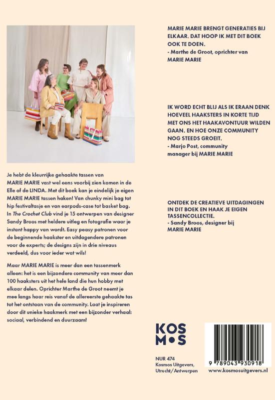 The Crochet Club is het haakboek van een heel bijzonder tassenmerk: Marie Marie. Auteur Marthe de Groot bracht maar liefst 75 haaksters samen in een groeiende community om hun hobby met elkaar te delen. Het resultaat is een unieke collectie handgemaakte tassen en een merk dat verbindend, sociaal en duurzaam werkt.