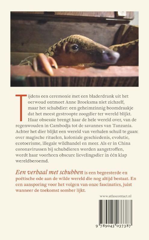 Tijdens een ceremonie met een bladerdrank uit het oerwoud ontmoet Anne Broeksma niet zichzelf, maar het schubdier: een geheimzinnig boomdraakje dat het meest gestroopte zoogdier ter wereld blijkt. Haar obsessie brengt haar de hele wereld over, van de regenwouden in Cambodja tot de savannes van Tanzania. Achter het dier blijkt een wereld van verhalen schuil te gaan: over magische rituelen, koloniale geschiedenis, evolutie, ecotoerisme, illegale wildhandel en meer. Als er in China coronavirussen bij schubdieren worden aangetroffen, wordt haar voorheen obscure lievelingsdier in één klap wereldberoemd.