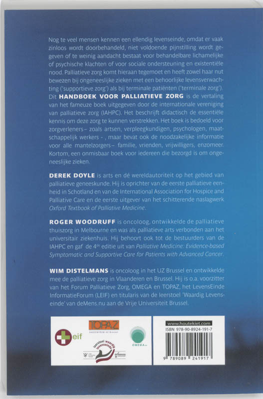 Dit Handboek voor palliatieve zorg is de vertaling van het bekende boek uitgegeven door de internationale vereniging van palliatieve zorg IAHPC. Het beschrijft didactisch de essentiële kennis om deze zorg te kunnen verstrekken. Het boek is bedoeld voor zorgverleners - zoals artsen, verpleegkundigen, psychologen, maatschappelijk werkers - , maar bevat ook de noodzakelijke informatie voor alle mantelzorgers - familie, vrienden, vrijwilligers, en anderen. Kortom, een onmisbaar boek voor iedereen die bezorgd is om ongeneeslijke zieken.